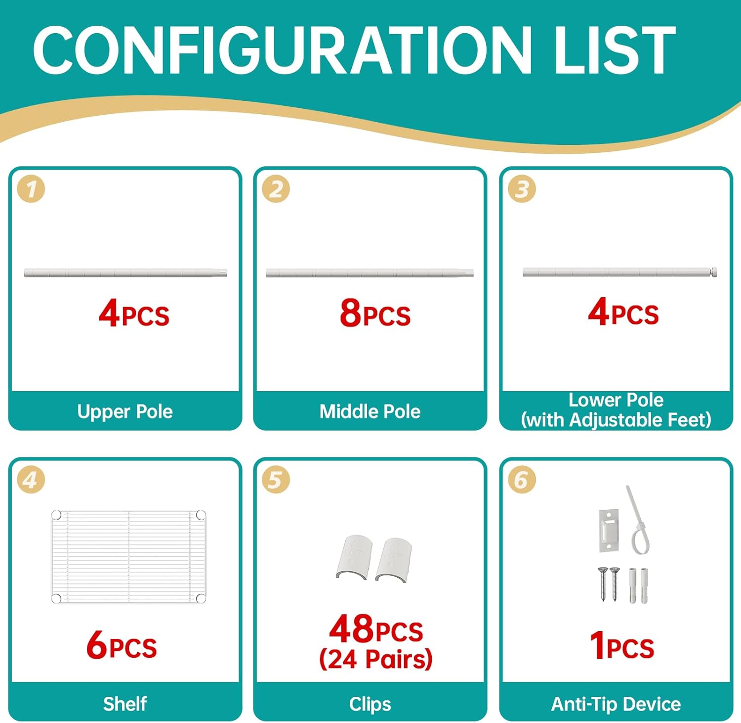 - Tool-free assembly: Enjoy the fun of DIY installation, with adjustable shelf heights to meet your needs. Comes with ground-leveling feet for better balance stability.4 sets of pipes (16 pieces) combined height 60 inches