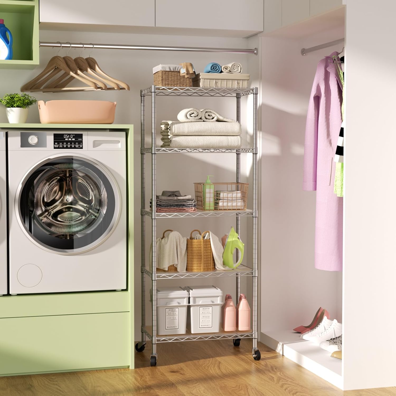 SINGAYE 5 Shelves Storage Shelf Wire Closet Bathroom Organizers Metal Pantry Kitchen Garage Shelving Unit Laundry Room Organization Home Rack Net Basket White with Wheels