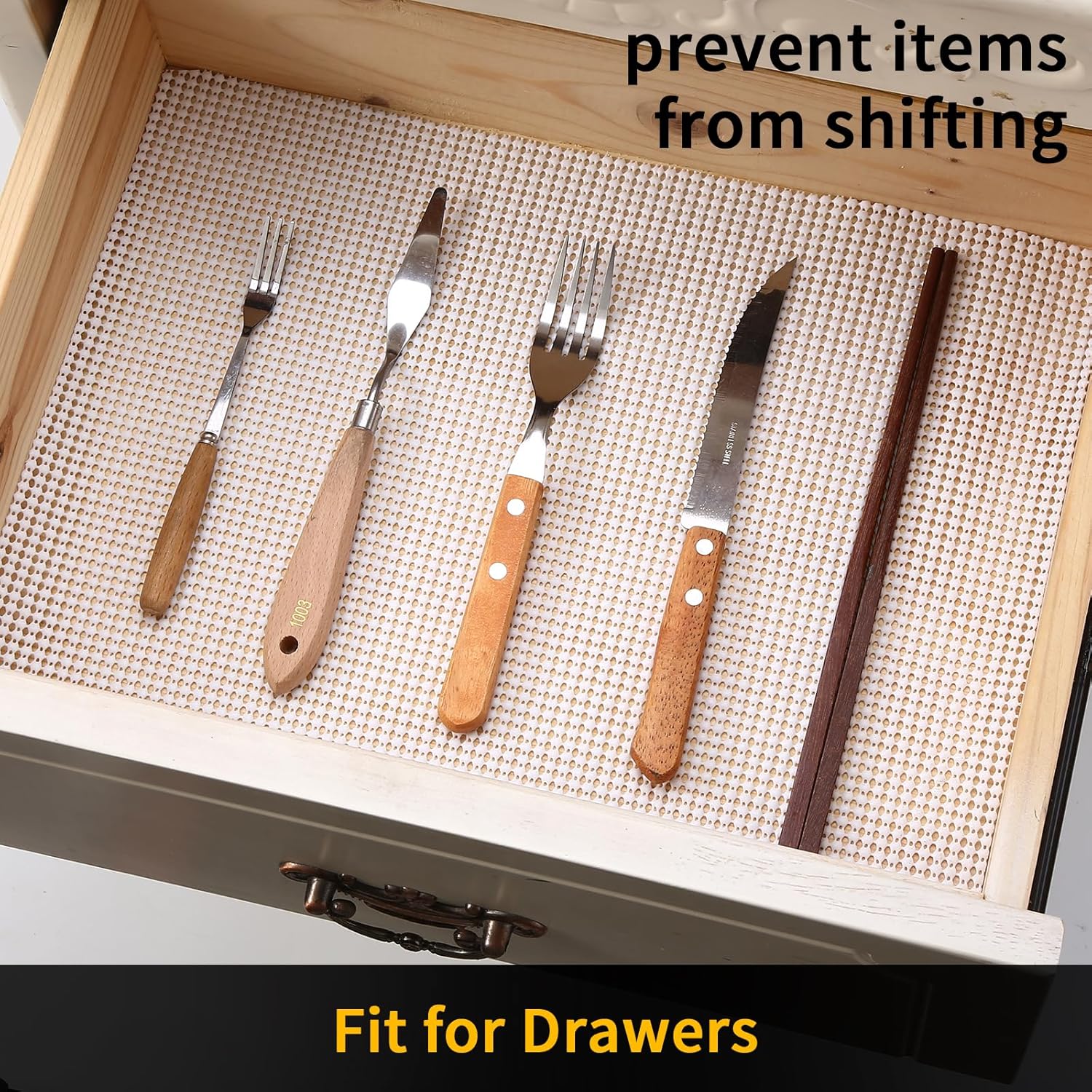 - THICK & DURABLE CONSTRUCTION TO KEEP ITEMS STATIONARY: The heavy-duty Shelf Liners prevent items from shifting in drawers or shelves. Ideal for organizing utensils, tools, or bathroom essentials, these Non-Adhesive Shelf Liners for Kitchen Cabinets maintain order while safeguarding surfaces.