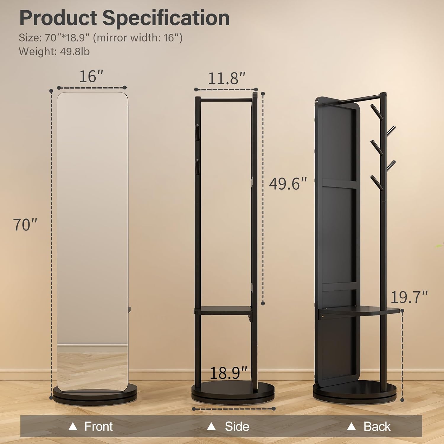 • 【Full Length Mirror】Measuring 70"x16", this standing mirrorr offers a wide view of your entire body. It is not only a full-length mirror, but also a practical coat rack and shelf, and a piece of art to decorate your home. Whether you're accessorizing or admiring your beauty, it allows you to look your best from every angle and start each day with confidence