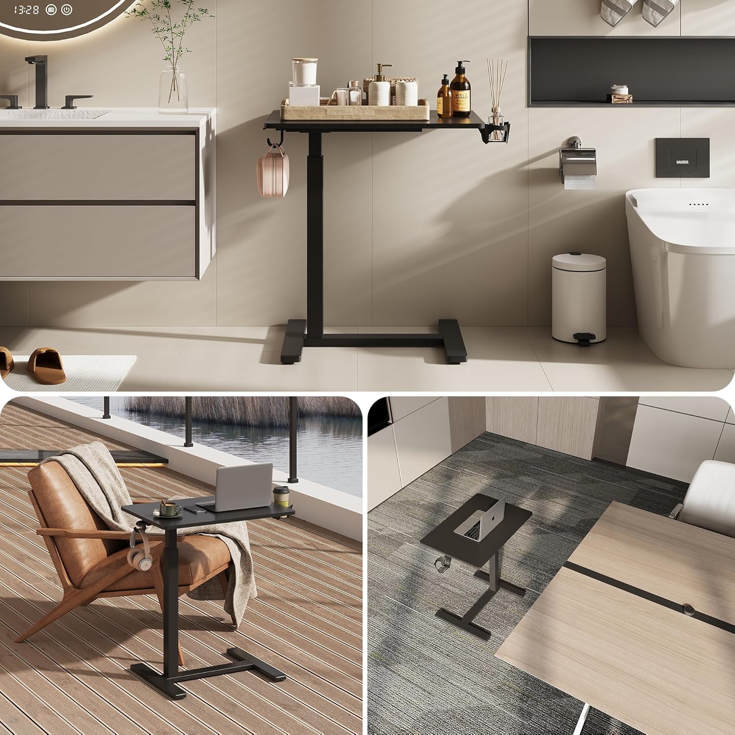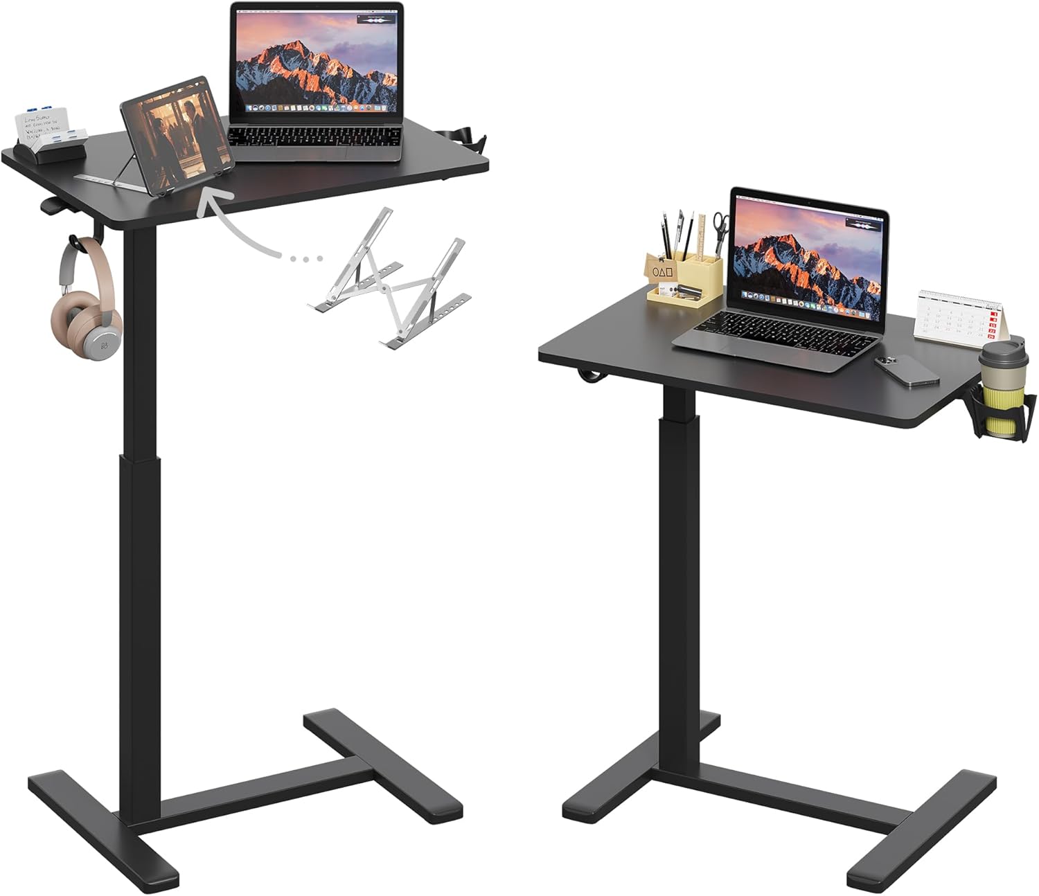 Gas Spring Adjustable Height Rolling Portable Laptop Desk, Mobile Standing Desk on Wheels, Small Sit Stand Desk with Laptop Stand/Cup Holder/Hook (Black, 26"x19")