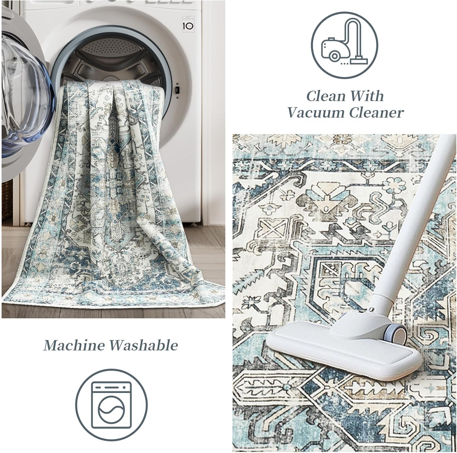 - Machine Washable Area Rugs: These rugs are machine washable and very easy to care for. The area rug can be washed in the washing machine without fading and can be reused by simply putting it in the washing machine and cleaning it!
