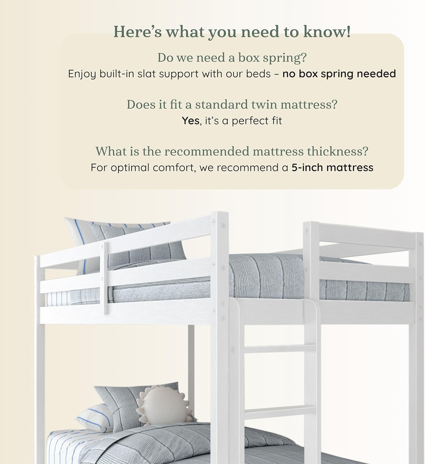 - Dimensions: Small bunk bed for small room measures 80.75” L x 42” W x 62.25” H. Wood bunk bed is compatible with standard twin-size mattresses between 5 and 8 inches thick.