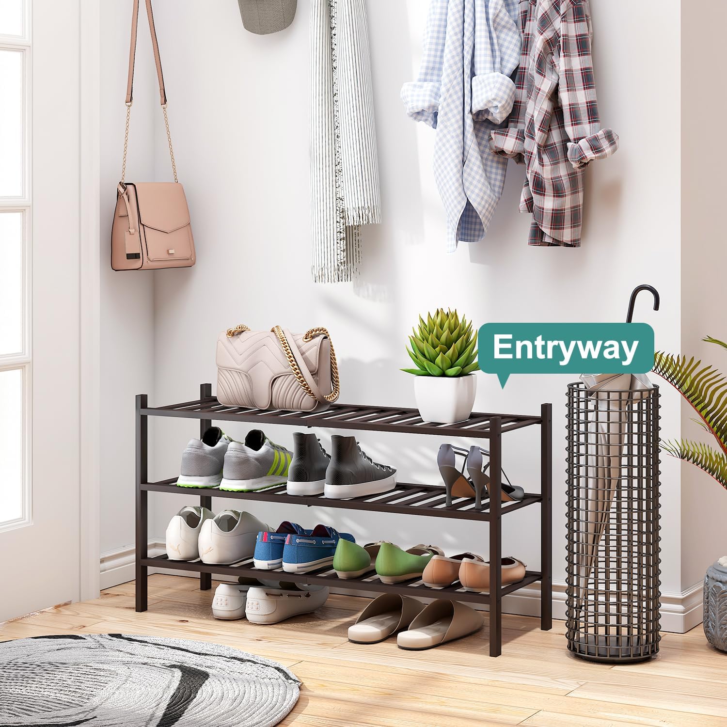 Long Shoe Rack, Bamboo Wood Shoe Rack for Closet, Entryway & Hallway, 3-Tier Stackable Shoe Shelf