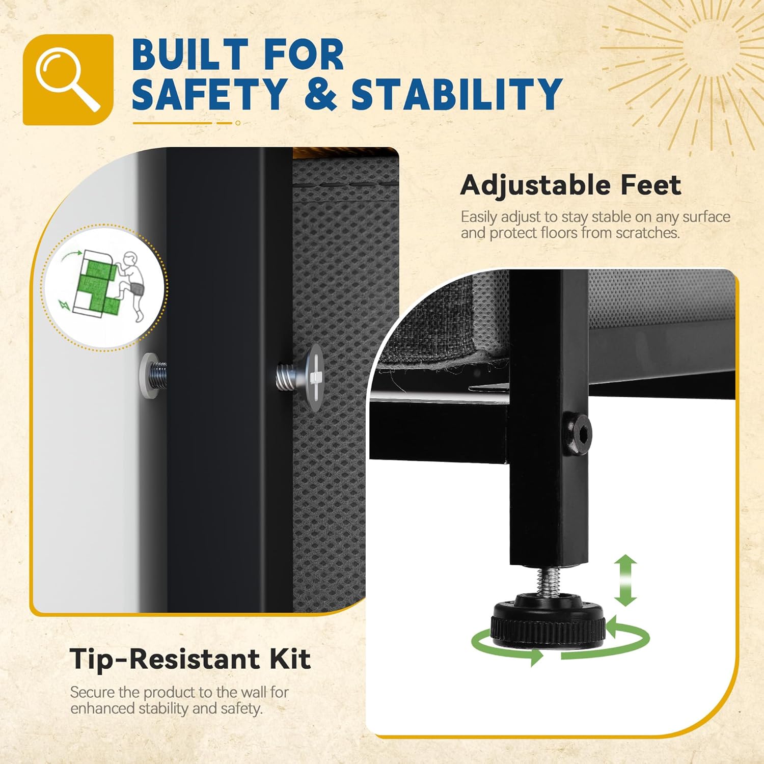 - STURDY DRESSER ORGANIZER- MDF wooden top and reliable metal frame lend immense support & extend shelf life; 4 adjustable plastic legs are for scratch protection and stability on uneven ground