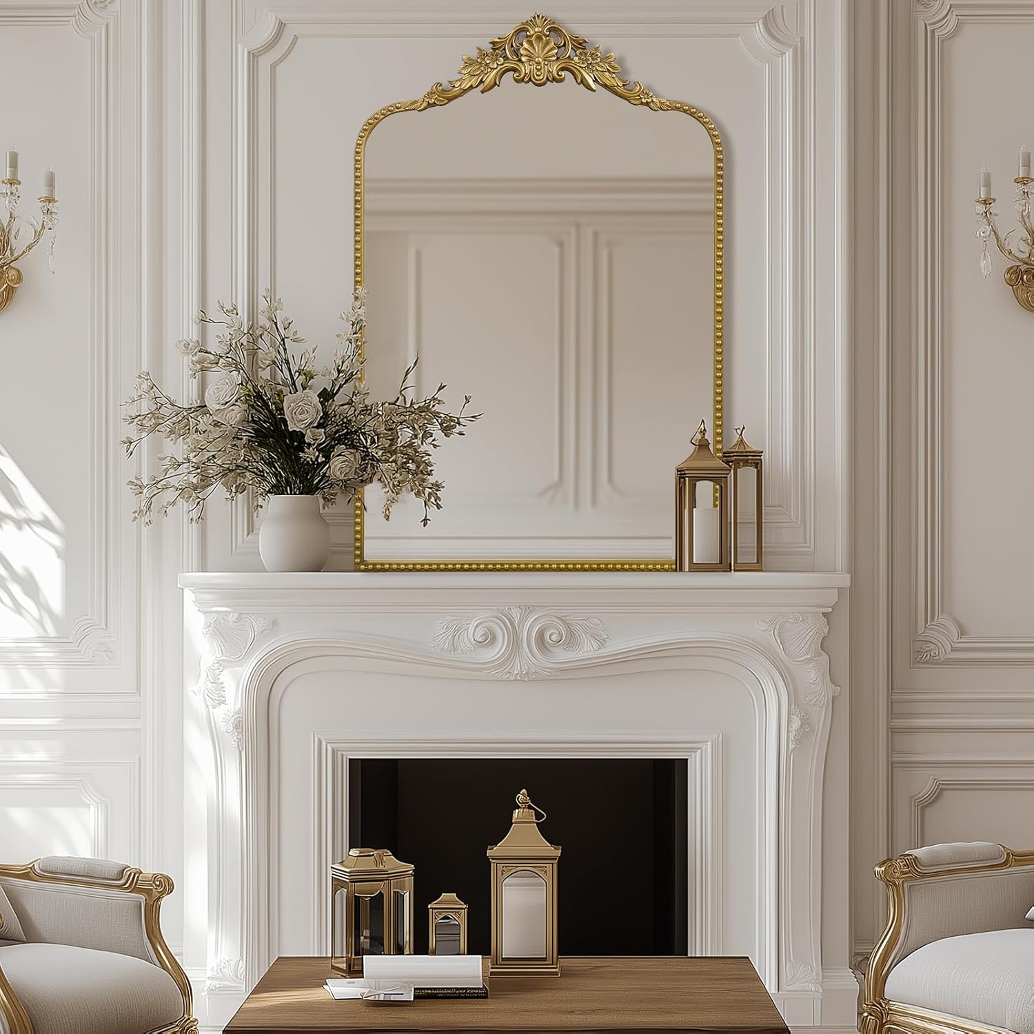 - Barque Style- Its ornate design, antique gold finish, and impeccable craftsmanship make it the perfect addition to any room. A statement piece that combines antique elegance with modern style. French country mirror will suitable for fireplace, bathroom, entryway, living room, bedroom, powder room, hall,and more.