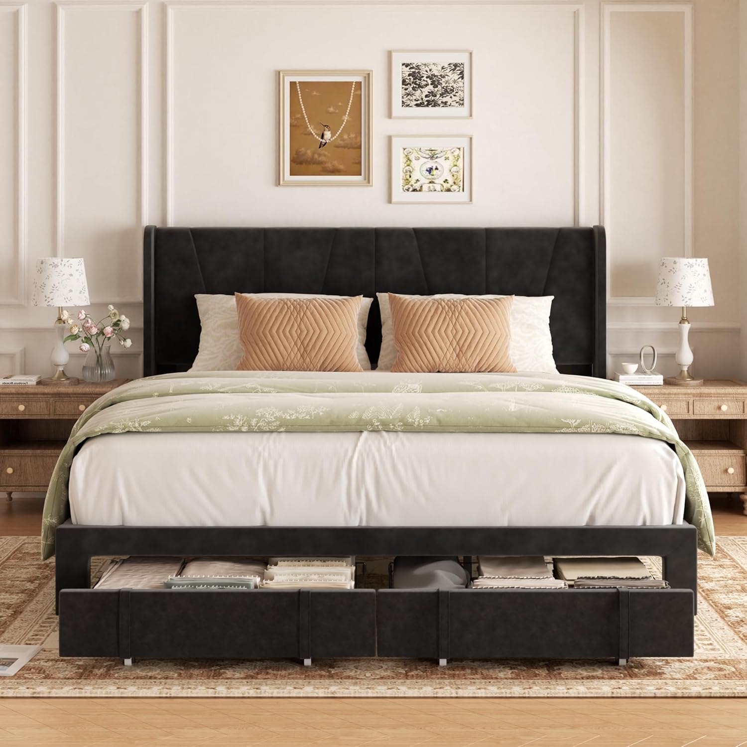King Bed Frame with Storage Drawers, Upholstered Platform Bed with Headboard and Wingboard, No Box Spring Needed, NO Noise, Easy Assembly, Wooden Support Slats, Black