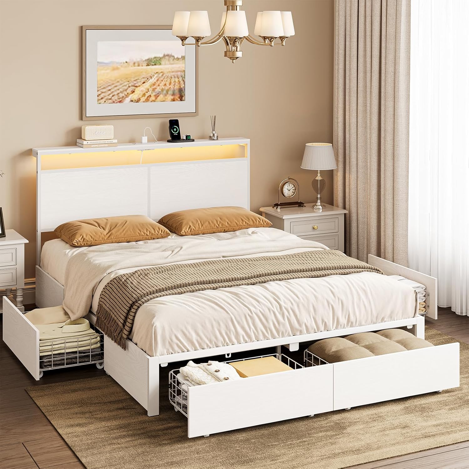 King Bed Frame with 4 Storage Drawers Bed Frame King Size with Headboard LED Lights Charging Station Metal Slats Platform Heavy-Duty Support No Box Spring Needed White