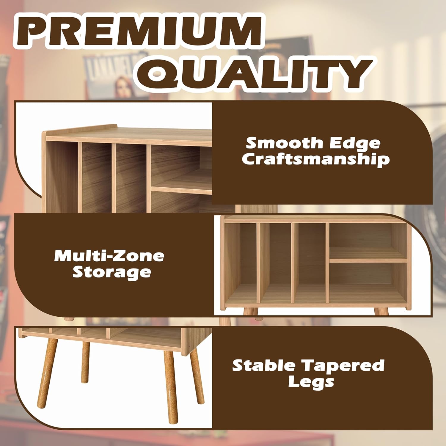 - 【Smart Storage for Your Collection】Featuring three vertical slots (each 13.8" high × 5.2" wide), this cabinet accommodates up to 100 LP records, keeping your collection sorted and easy to access. The right side includes two open shelves (each 13" wide × 7" high), ideal for radios, books, or storage boxes, making it a multifunctional piece for music and beyond.