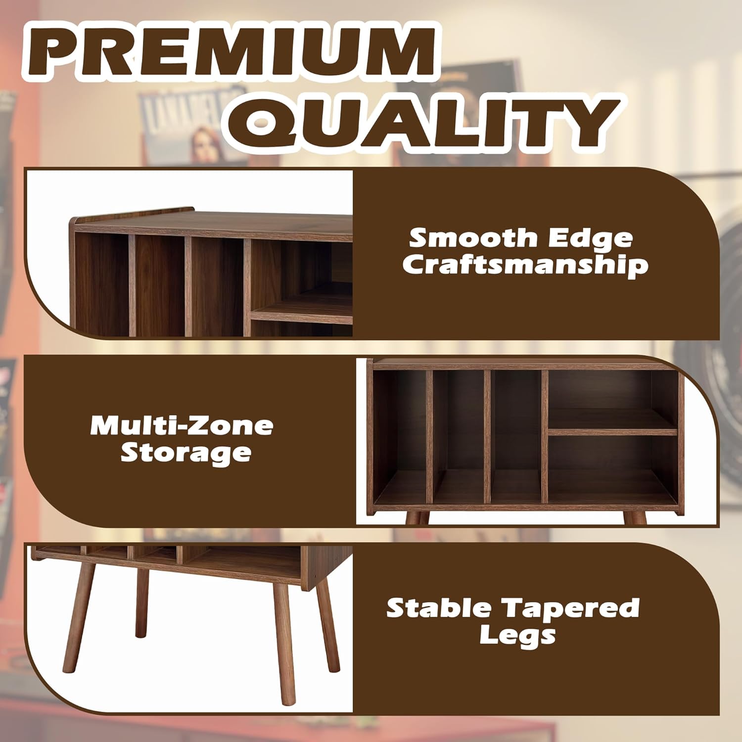 - 【Durable Build & Sturdy Structure】Crafted from durable engineered wood and supported by solid wood legs, this stand offers reliable strength and structure. The top surface holds up to 160 lbs—enough for turntables, compact speakers, or display items—while the lower compartments stay steady and upright.
