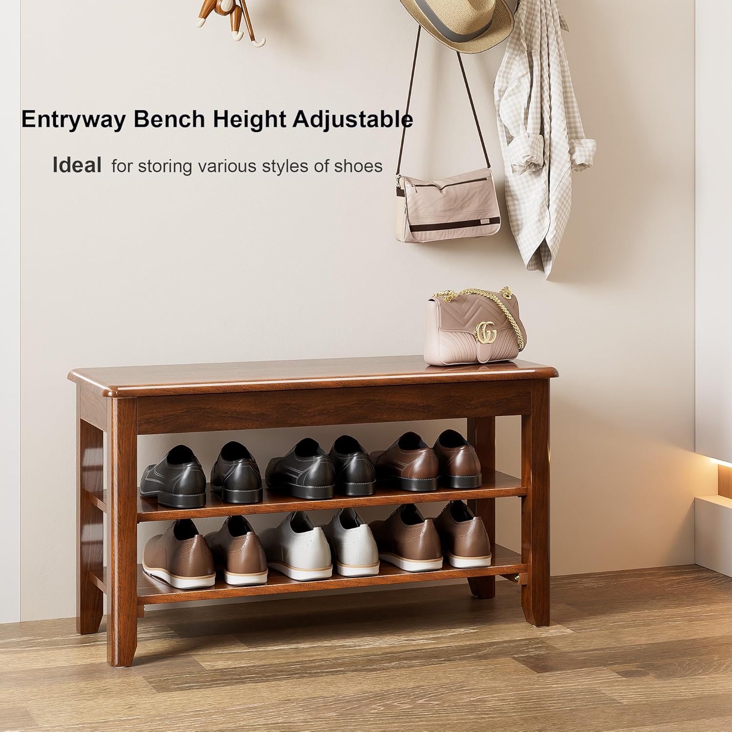 Shoe Storage Bench for Entryway - 3 Tier Shoe Rack for Front Door Entrance, Rubberwood Shoes Rack Height Adjustable, Entryway Bench with Shoes Storage for Any Room (Walnut, 31.5" W)