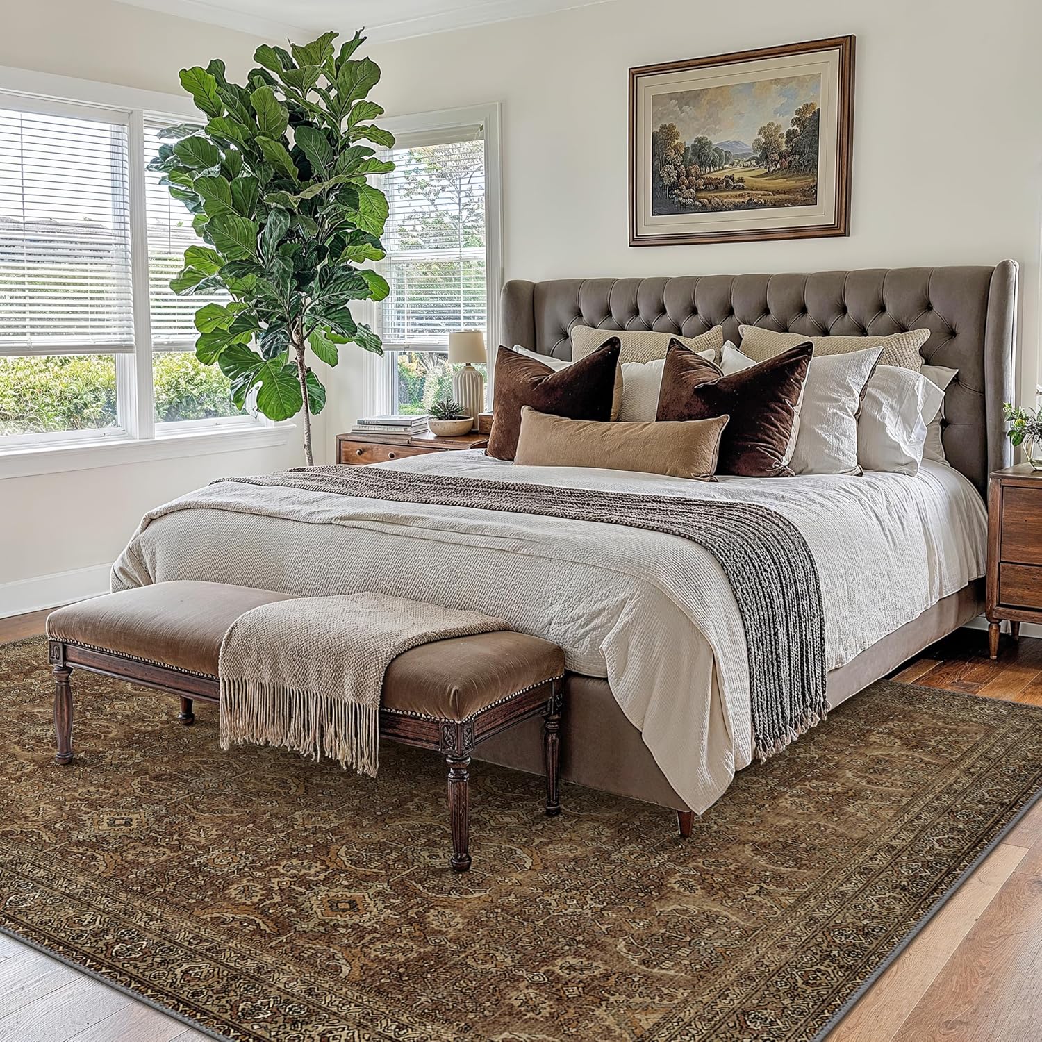 10X12 Area Rugs Machine Washable Rugs for Living Room, Vintage Boho Large Rugs for Bedroom Dining Room, Non Slip Indoor Soft Distressed Lightweight Thin Low Pile Carpet, Rustic Brown