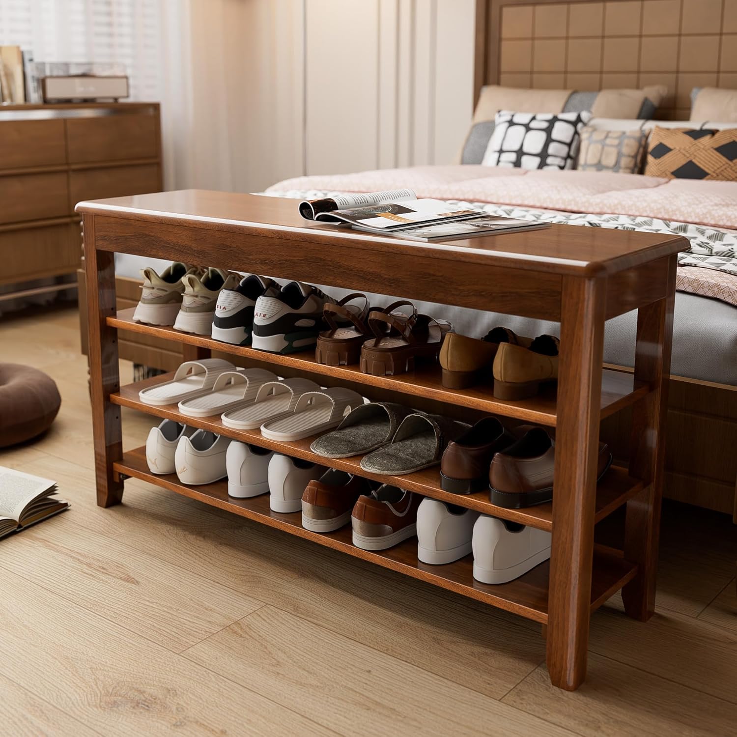 - ăSturdy & Durable MaterialăThis solid wood shoe rack bench is made of 100% FAS grade rubberwood for durability and longevity, with a maximum weight capacity of 550 lb to ensure stability. Add warmth and texture to your home with this mid-century modern shoe bench in an elegant walnut color.