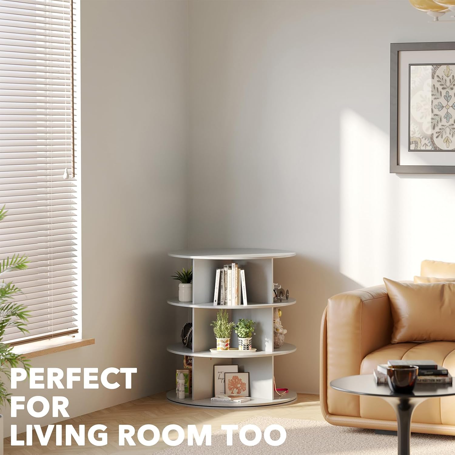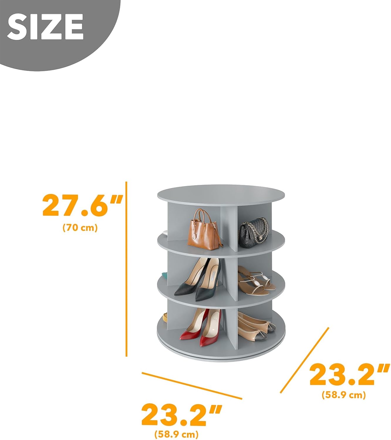 - ORGANIZED AND BEAUTIFUL - Make your shoes neat and organized with this rotating shoe rack tower lazy susan; The space saving design can hold up many shoes or bags in a compact space; SIZE: 23.2"W x 23.2"D x 27.6"H