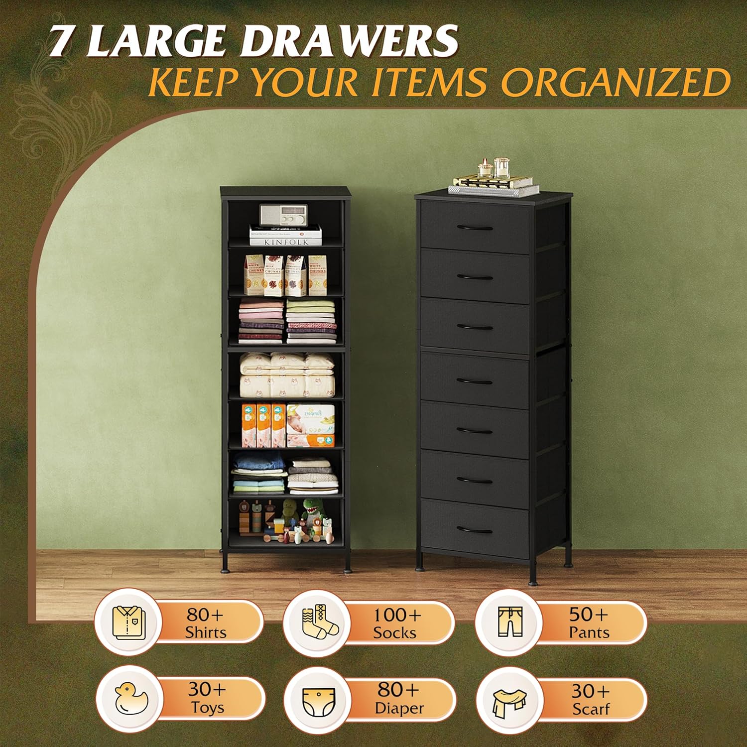 - 【✨ Ample Storage Dresser】Measures 11.73"D x 15.67"W x 45.28"H, our fabric dressers is equipped with 7 detachable fabric drawers, which facilitate the orderly storage of clothes and daily items, while the woodtop provides display space for artworks and small ornaments, and more life style!