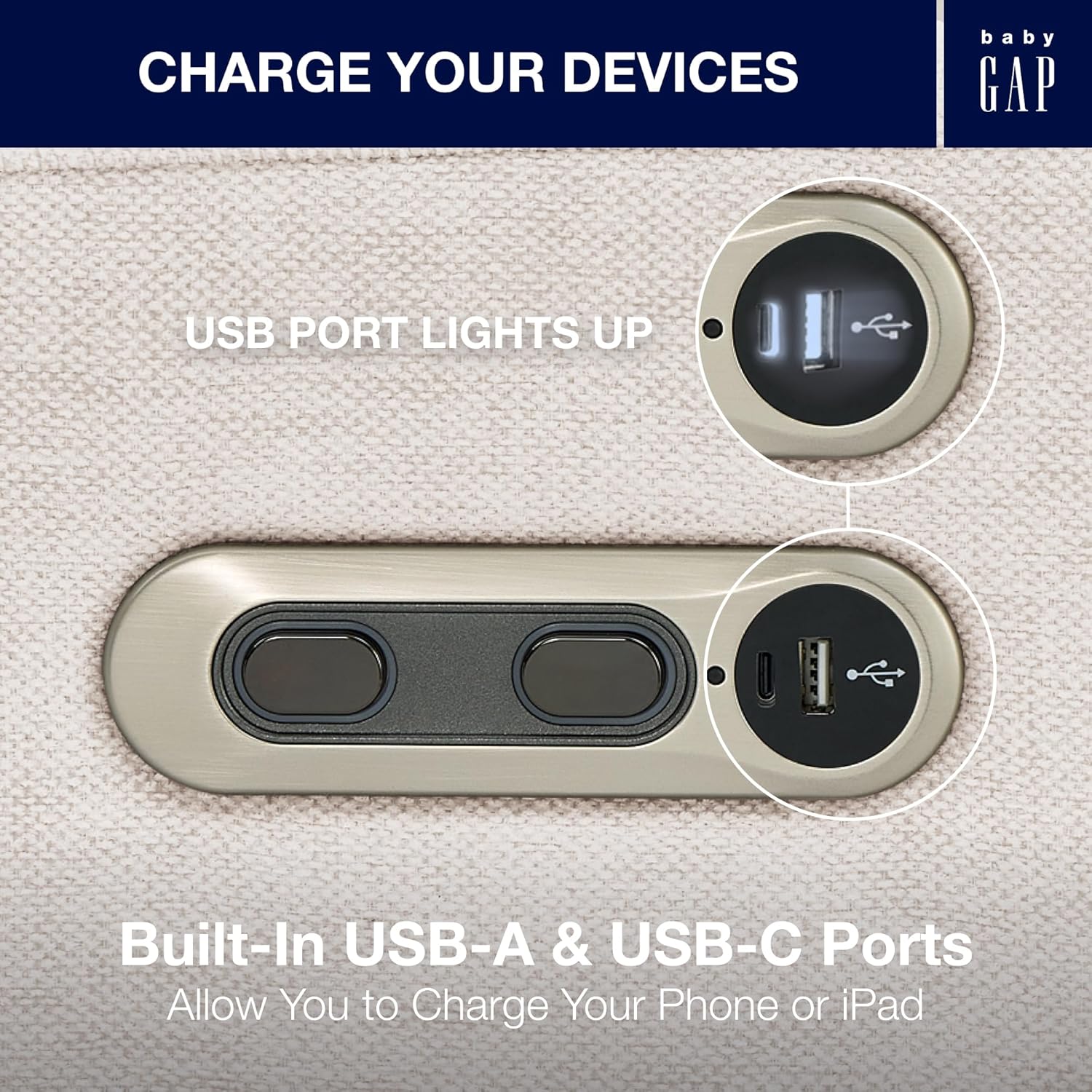 Delta Children babyGap Harlowe Power Recliner with USB-A and Type-C Ports Greenguard Gold Certified – Stain-Resistant Performance Fabric is Oeko-TEX Standard 100 Certified, Sand