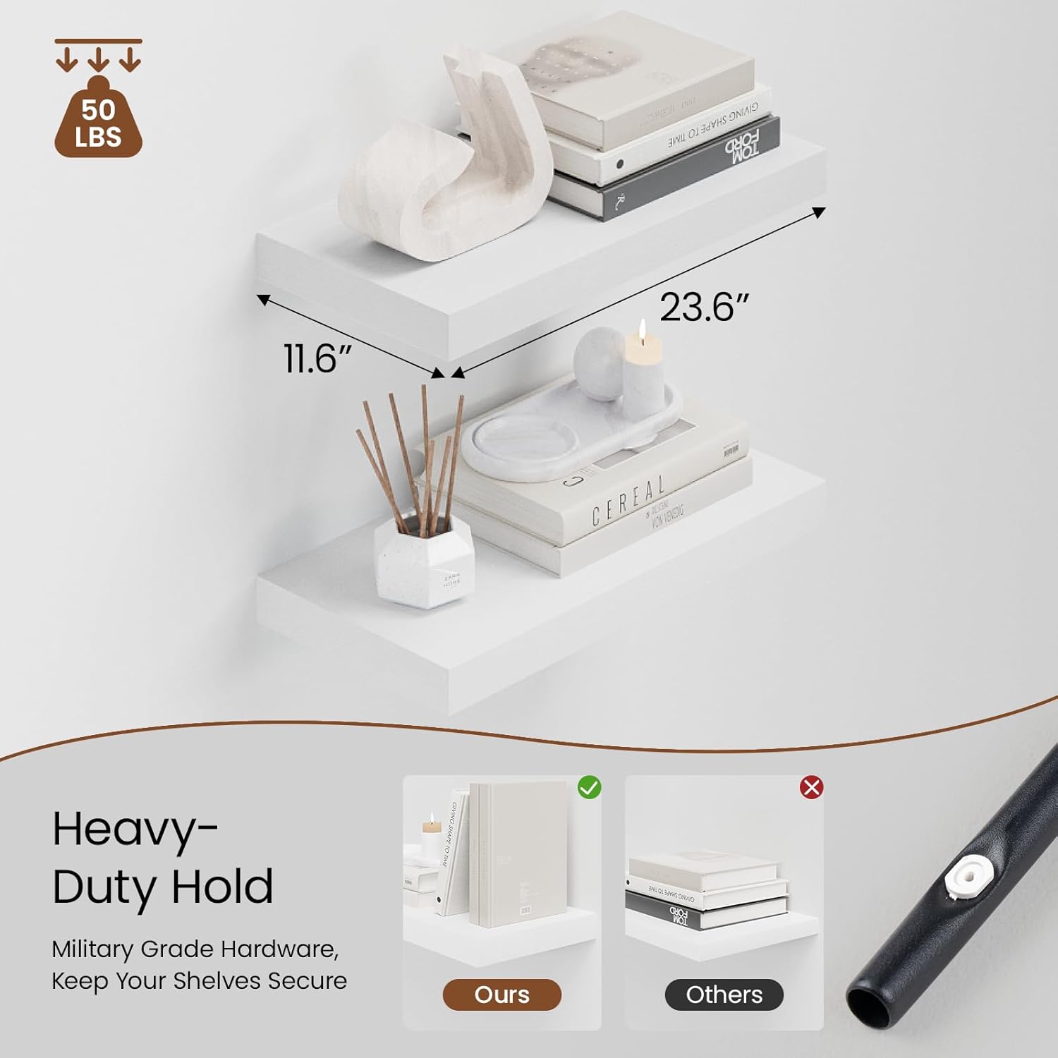 - Extra Deep Floating Shelves: Measuring 11.6” D x 23.6” W x 1.5” H, these shelves are crafted for maximum depth and durability. The spacious 12” depth gives you plenty of room for stylish display, organized storage, and decorative accents. Perfectly suited for your bathroom, kitchen, or living room, they enhance both function and flair in any space!
