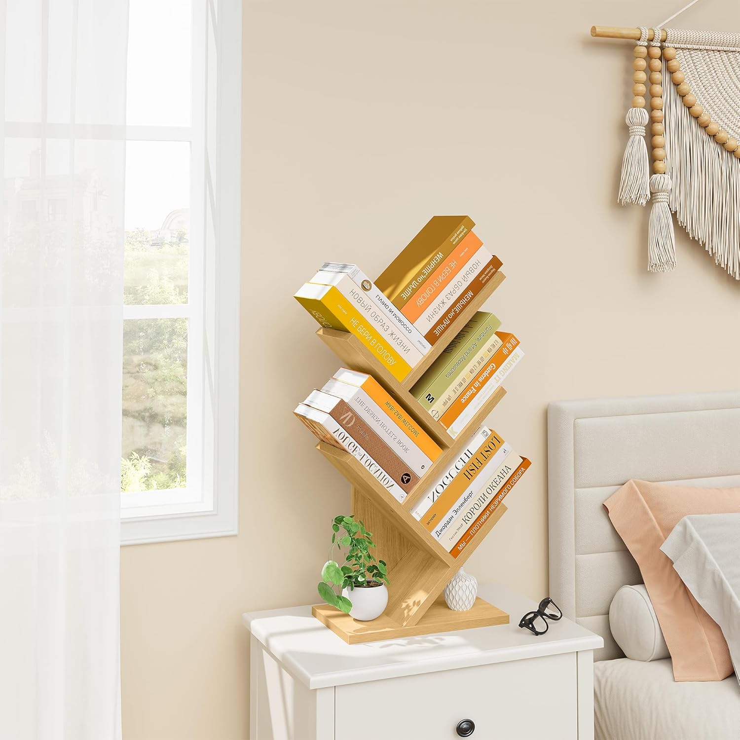 Hoctieon 4 Tier Tree Bookshelf, 4 Shelf Bookcase, Free Standing Tree Bookcase, Display Floor Standing Shelf for Books, Book Organizer Shelves for Home Office, Living Room, Bedroom, Yellow