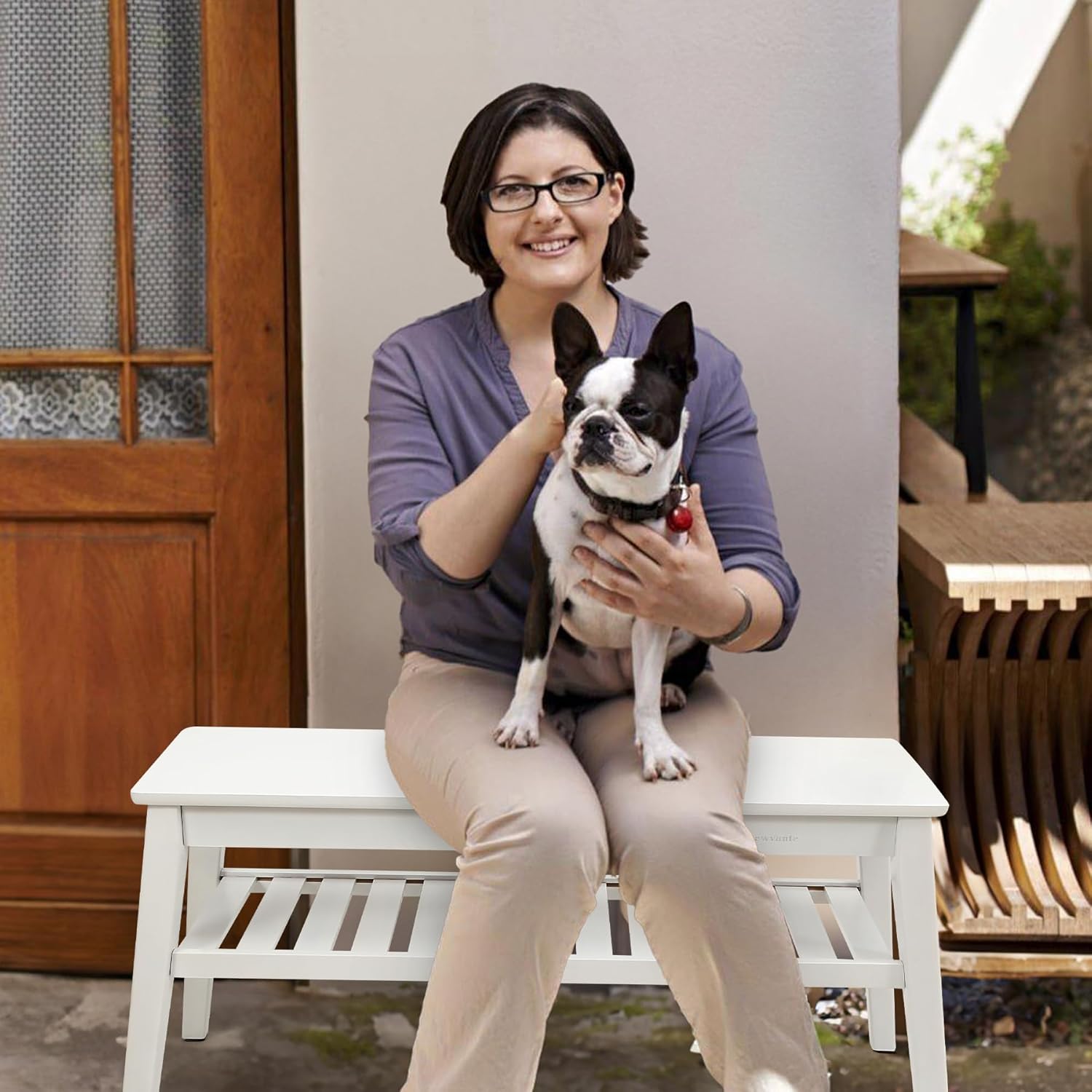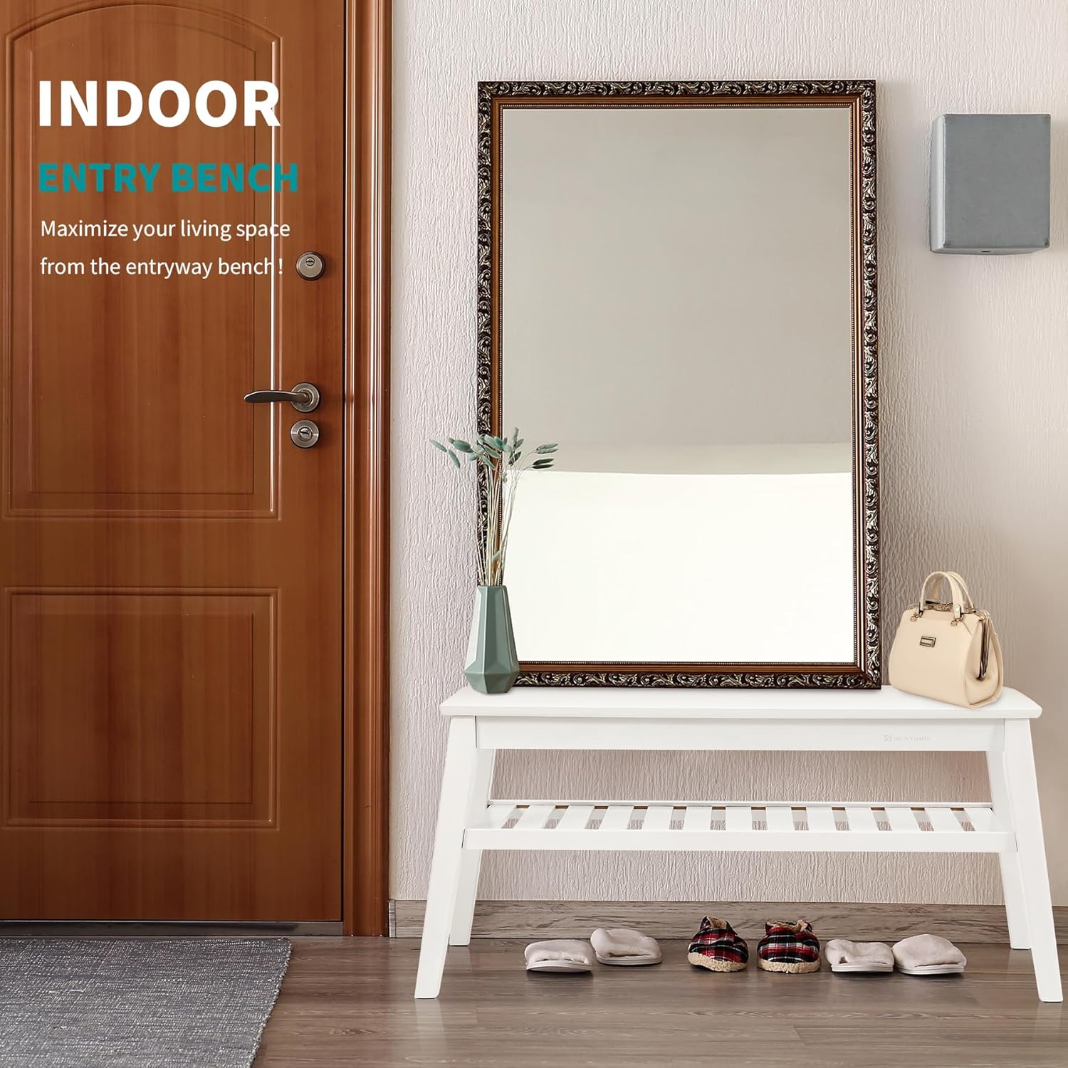 Nnewvante 33.46" Bamboo Dining Bench, 2 Tier Indoor White Storage Bench for Entryway, Outdoor Wooden Bench, Small Wood Benches for Front Porch, Living Room, Bedroom, Holds up to 300 lbs