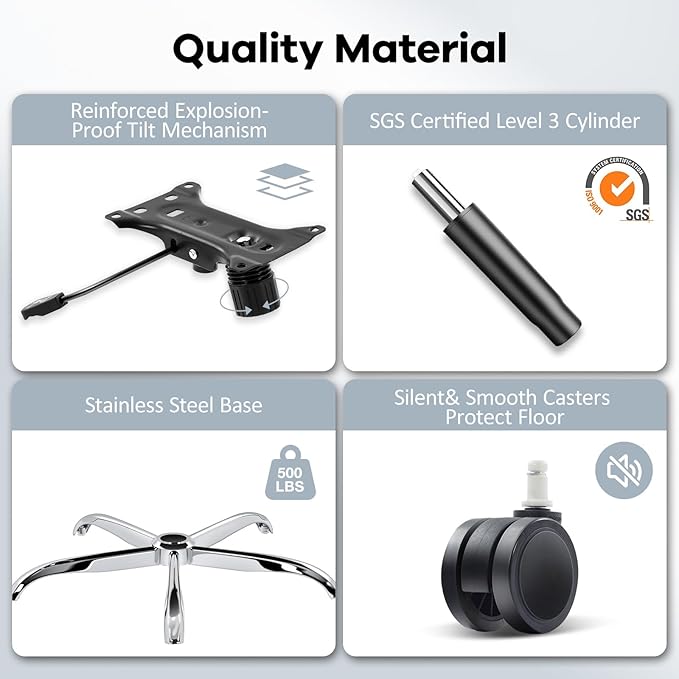 - Sturdy and Durable:Constructed with a high-quality stainless steel base, SGS Level-3 gas lift cylinder, and reinforced explosion-proof tilt mechanism, this chair can support up to 330 lbs. smooth-gliding caster wheels for effortless movement on any floor type.