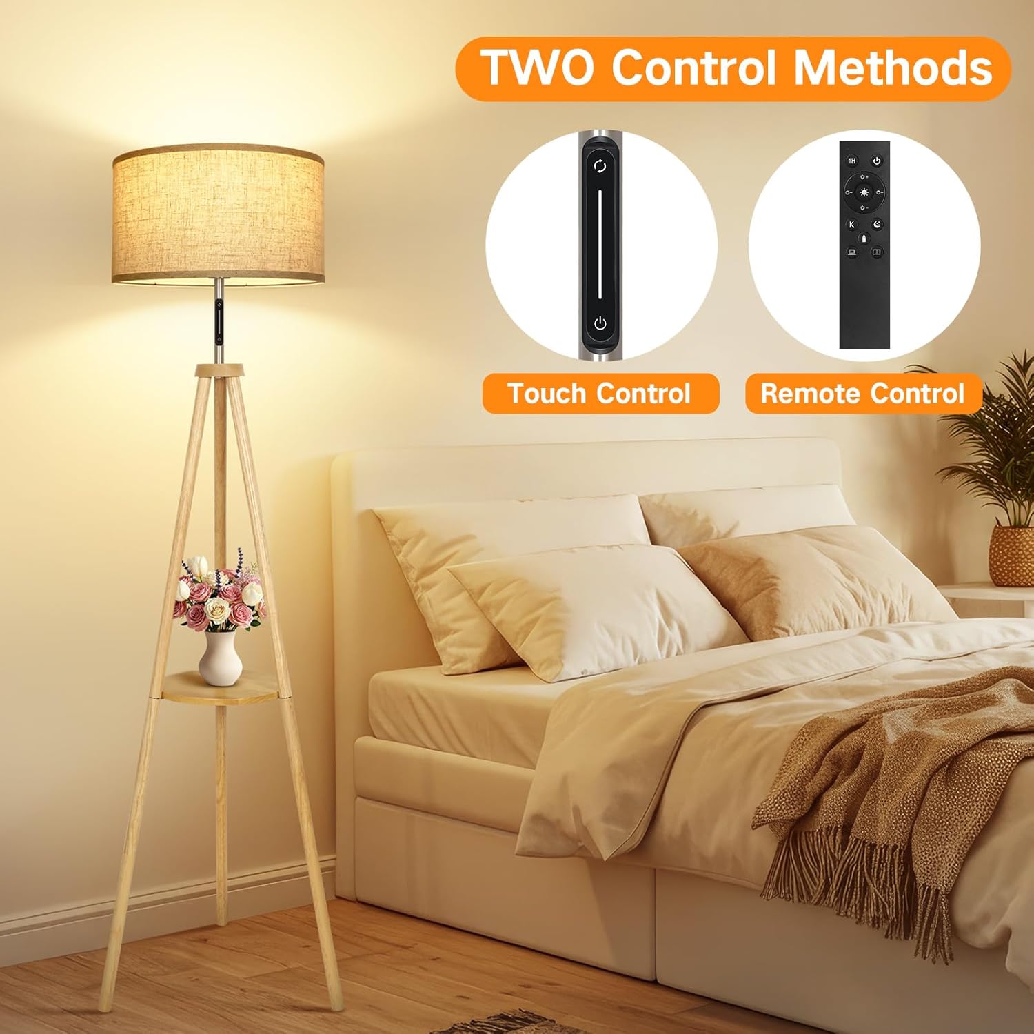 OUTON Wood Tripod Floor Lamp with Shelves, Mid Century LED Modern Dimmable Floor Lamp with Remote Control, Sturdy Tall Standing Lamp with Beige Lamp Shade for Living Room, Bedroom, Office