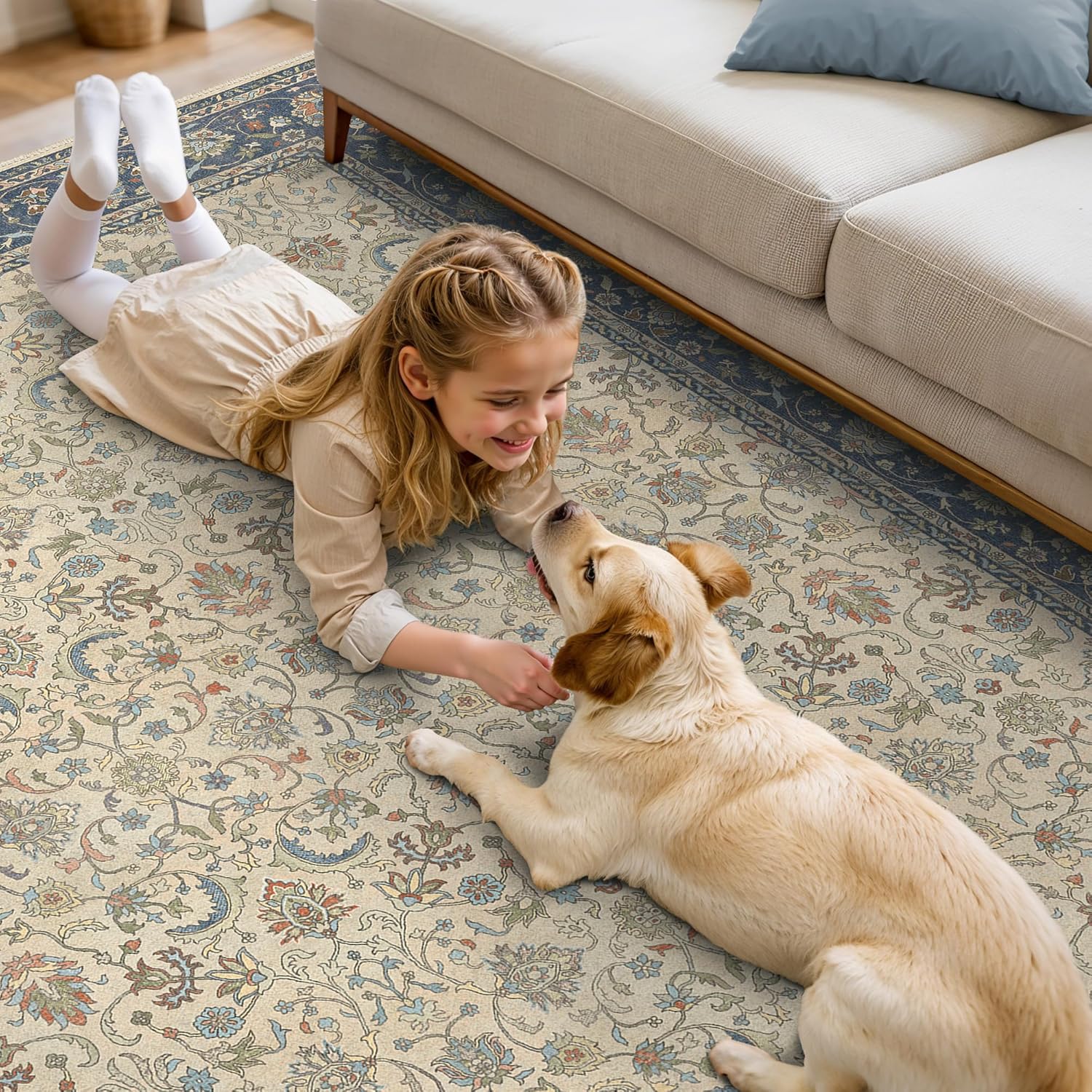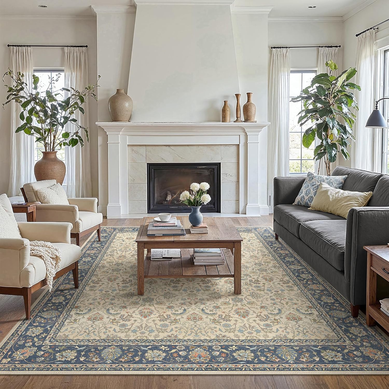 8X10 Area Rugs Machine Washable Rugs for Living Room, Vintage Boho Large Rugs for Bedroom Dining Room, Non Slip Indoor Soft Distressed Lightweight Thin Low Pile Carpet, Ivory Navy Blue