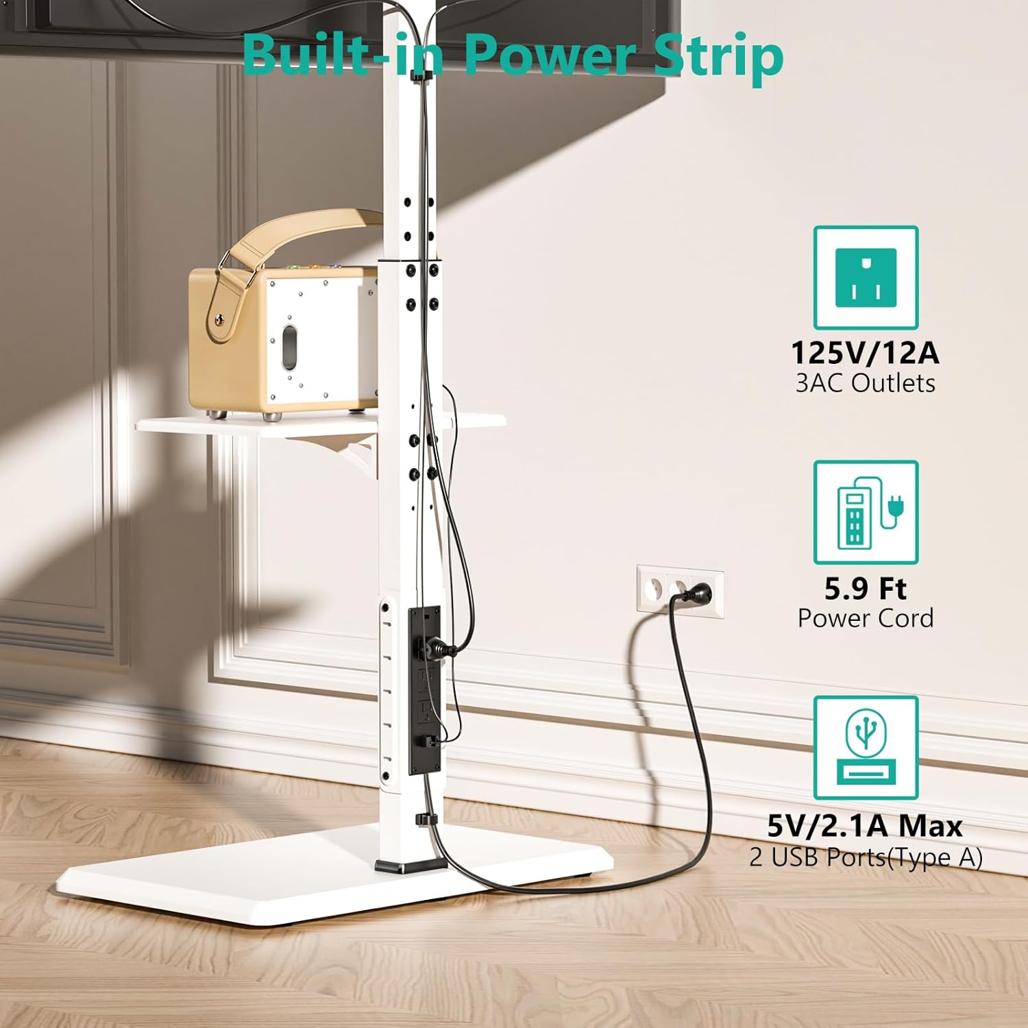 - BUILT-IN POWER HUB: The WALI TV stand mount features a convenient integrated power outlet on the back, including 2 USB ports (5V/2.1A) and 3 AC outlets(125V/12A). With a 5.9ft power cord, it provides easy access to power for your TV and devices