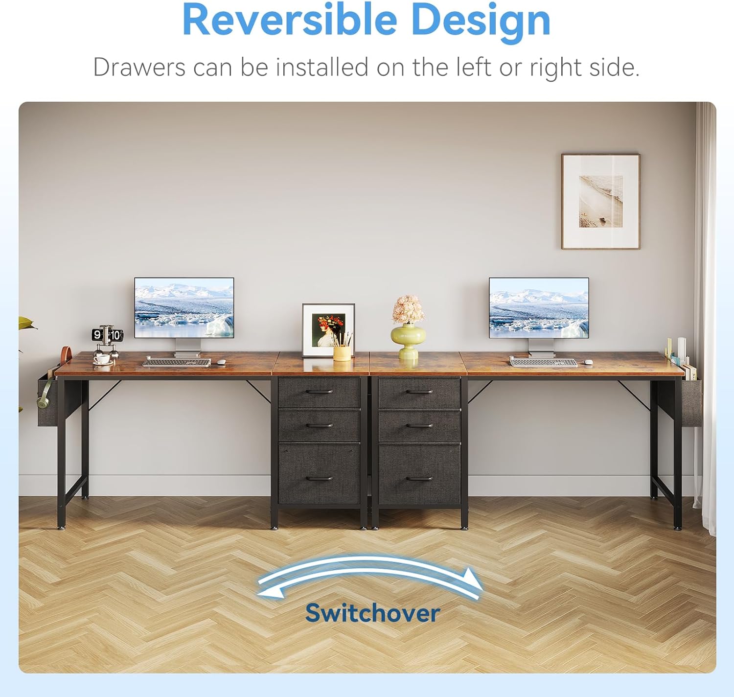 - Fabric File Cabinet and Fabric Drawers: This practical desk comes with 1 fabric file cabinet and 2 fabric drawers, providing versatile storage for letter, A4, or legal-sized files. The drawers are designed for easy cleaning, helping you keep office or study supplies organized and dust-free, while the spacious desktop ensures a clutter-free and productive workspace.