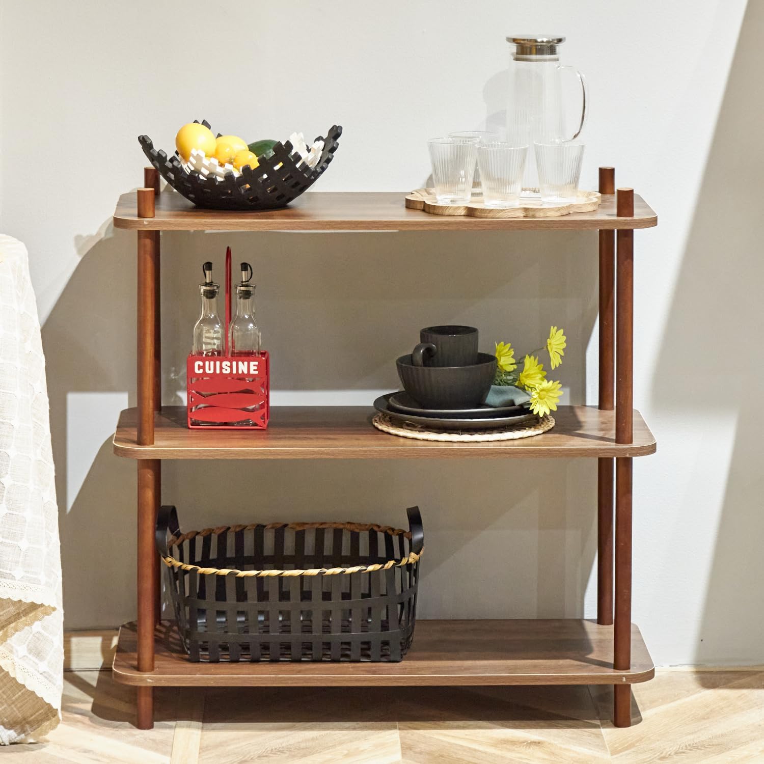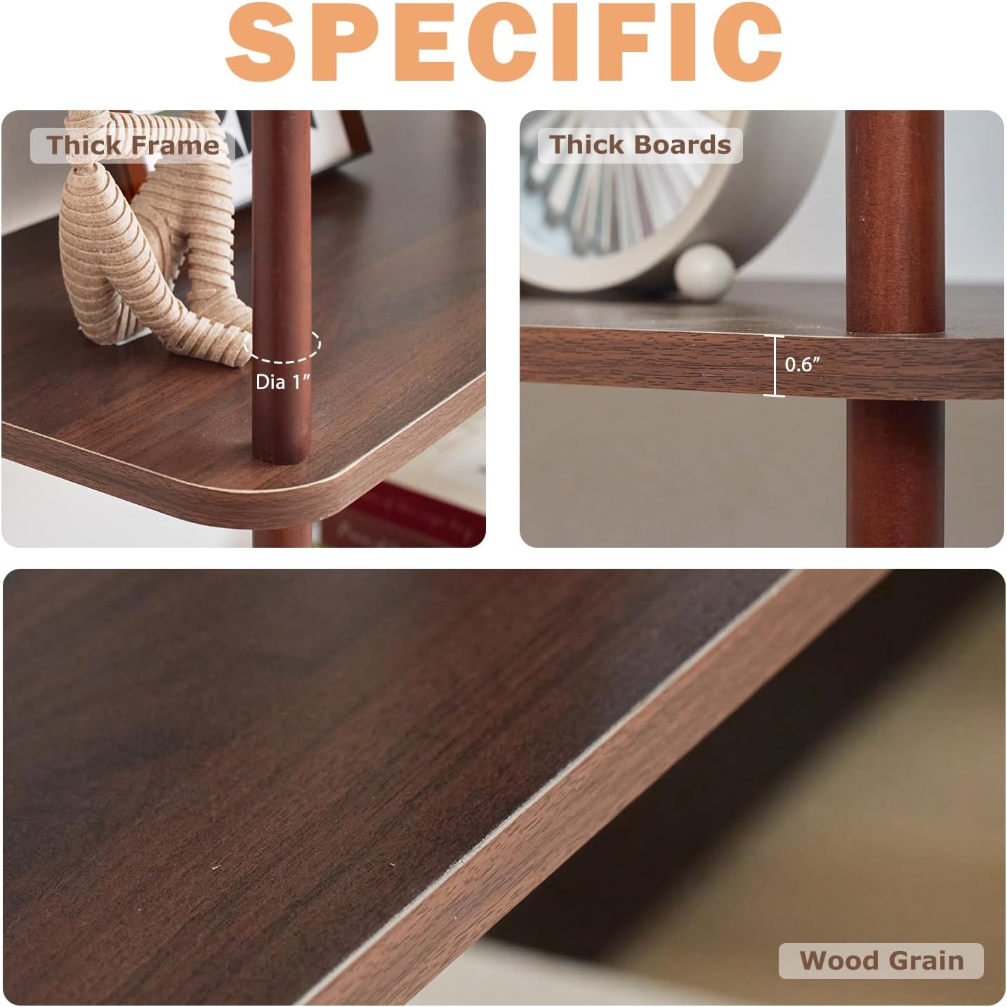 - [Sturdy Wood Contruction]:3 tiers in total,every single tier has 0.6 inch thick,each of them capacity 66LBS weight,thatโs enough hold both books and different items.