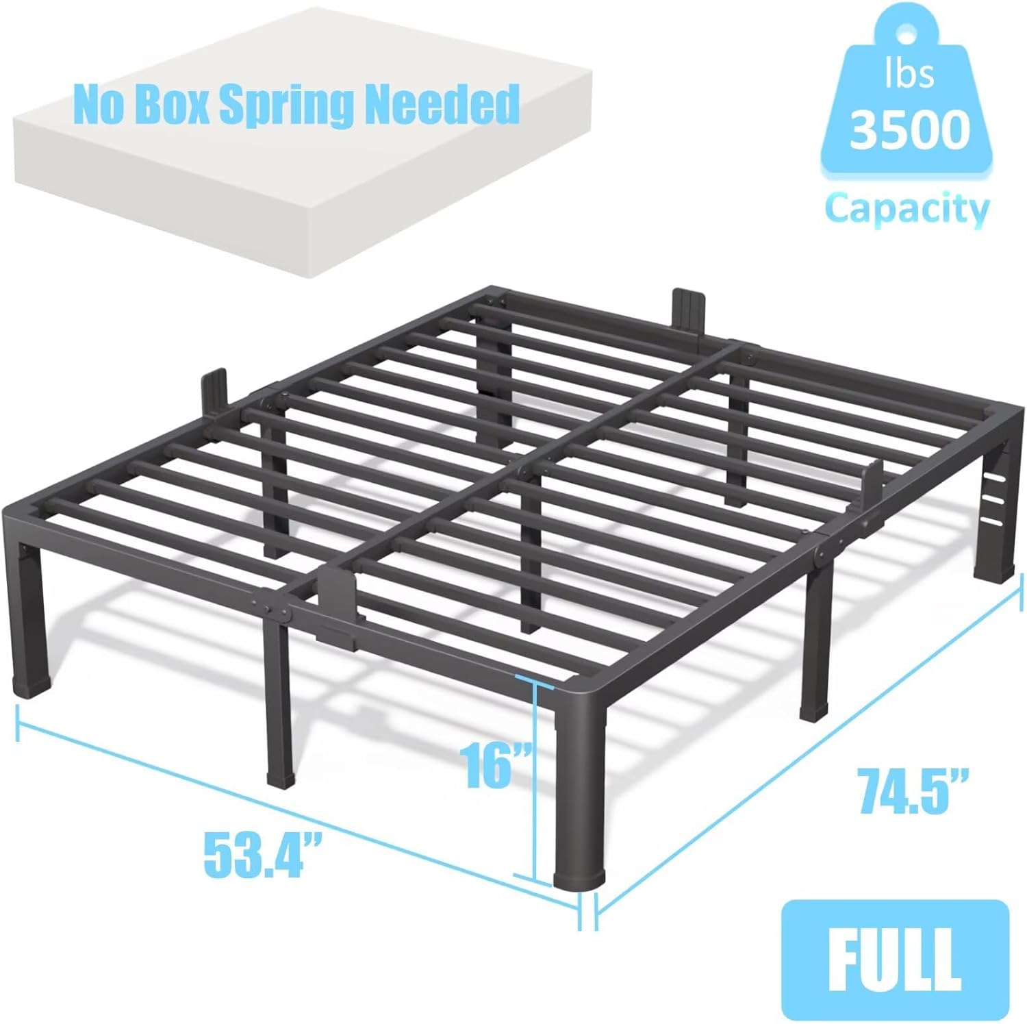 - IDEAL SIZE: The size of the Full bed frame: 74.5"L x 53.4"W x 16"H. Suitable Mattress: 75" x 54". This Full platform bed frame with 4 mattress stoppers that secure the mattress to prevent sliding.