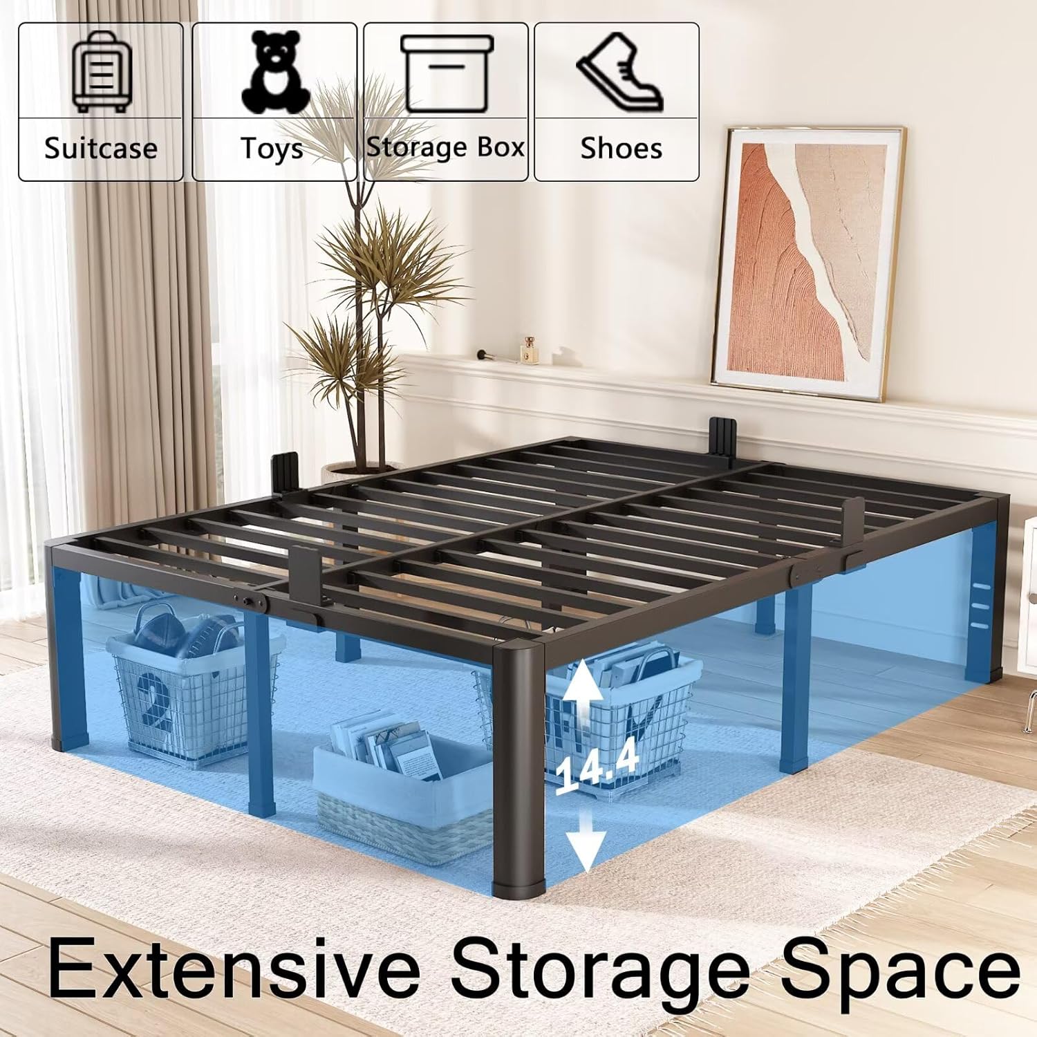 - REASONABLE STORAGE SPACE: The 16 inch bed frame has 14.6 inches of under-bed storage space for boxes, clothes, toys, quilts and more, keeping the room neat and organized and reducing clutter.