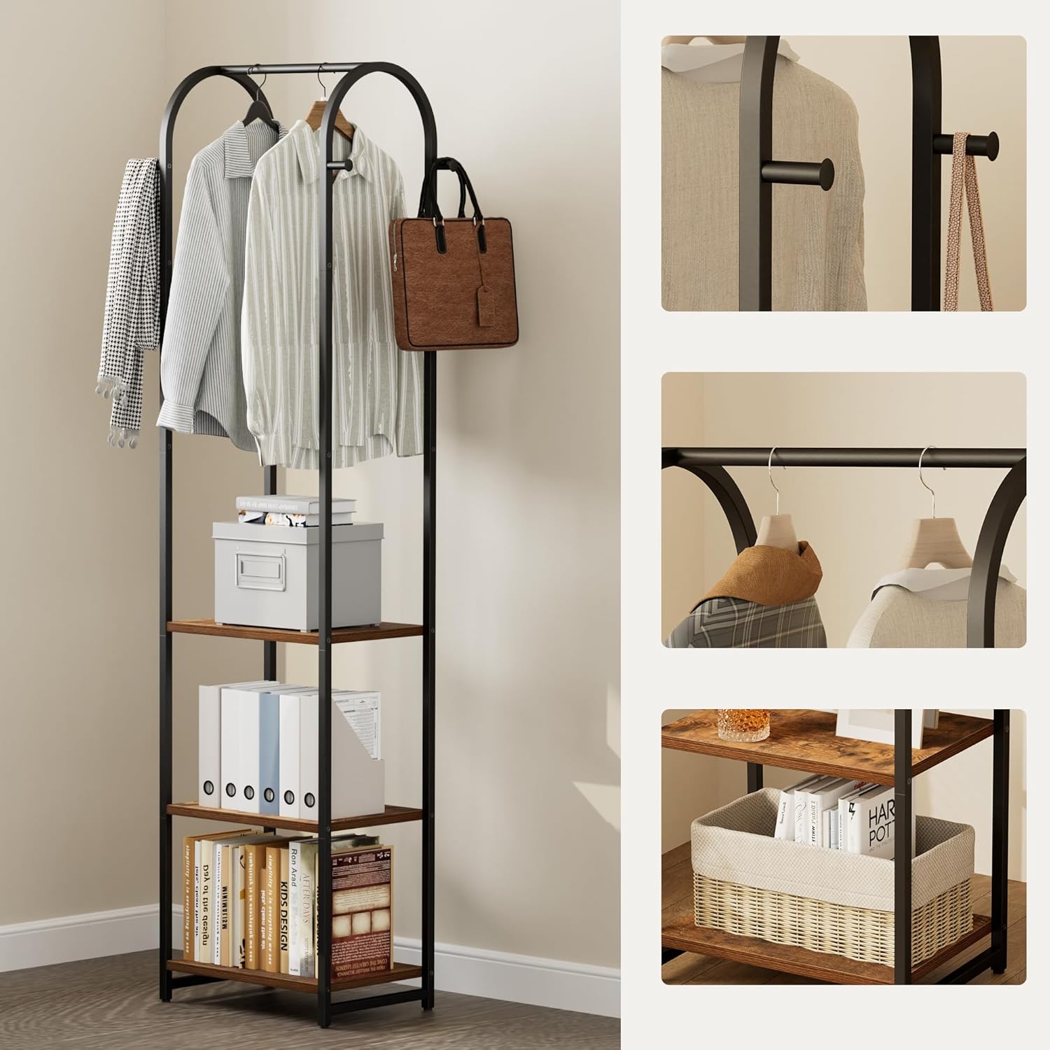 Garment Rack, Coat Rack With 3 Shelves and 4 Hooks, 71" H Clothes Stand For Hanging Clothes, Hanging Rod For for Bedroom, Hallway, Entryway, Office, Living Room, Rustic Brown and Black