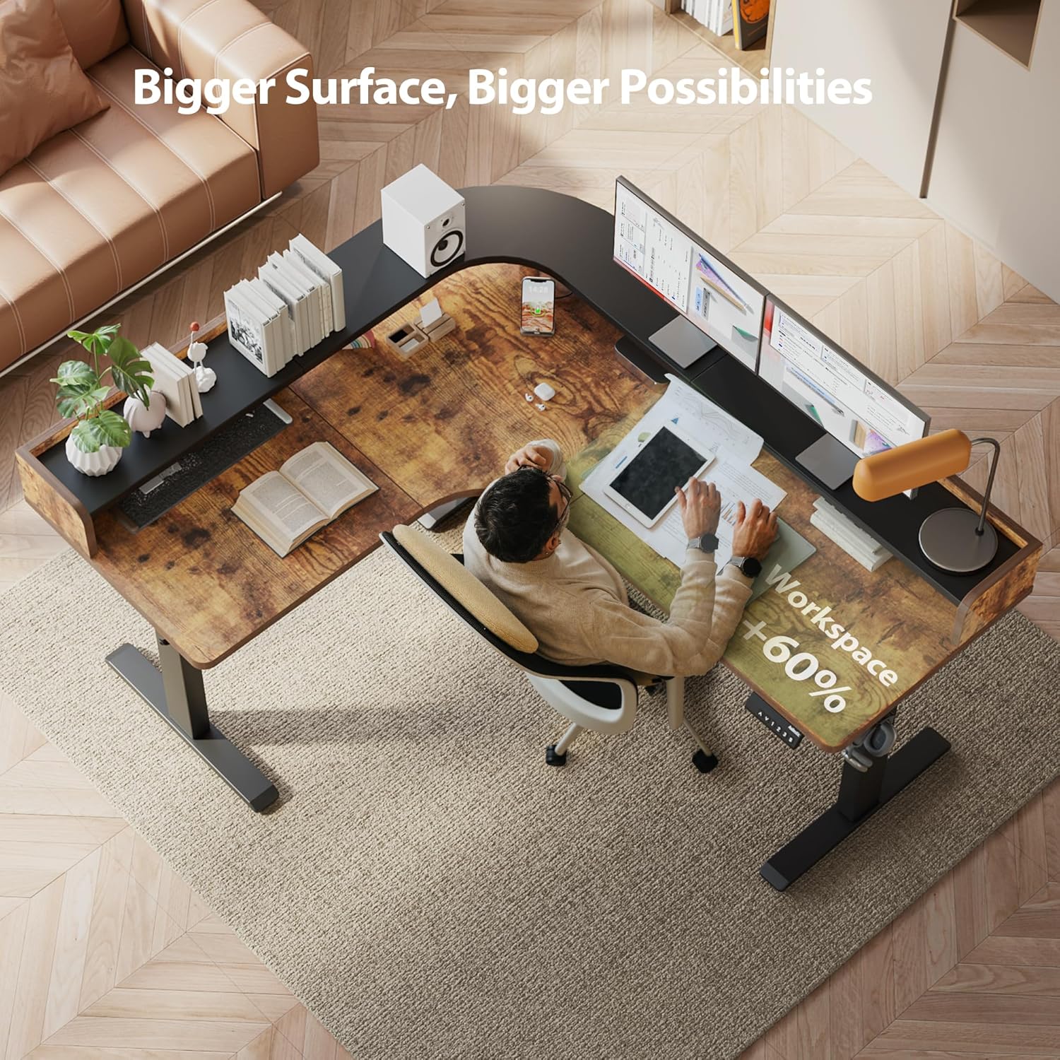 - ăErgonomic L Shape DesignăL shaped design maximizes workspace with ergonomic support, reducing back and neck strain during long-term use. The three panel layout supports seamless multitasking and organized workspace zoning.