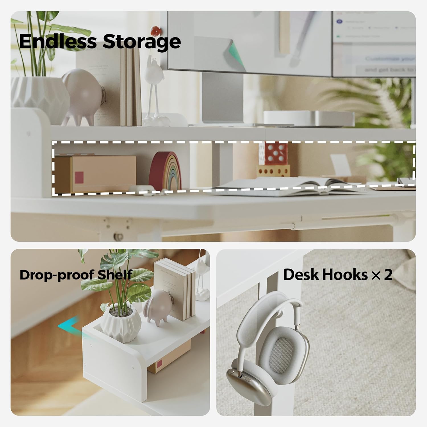 - ăSpacious Storage SpaceăThe elevated top shelf adds 30% extra space, dual computer monitors, printers and decor, everything you need is organized.