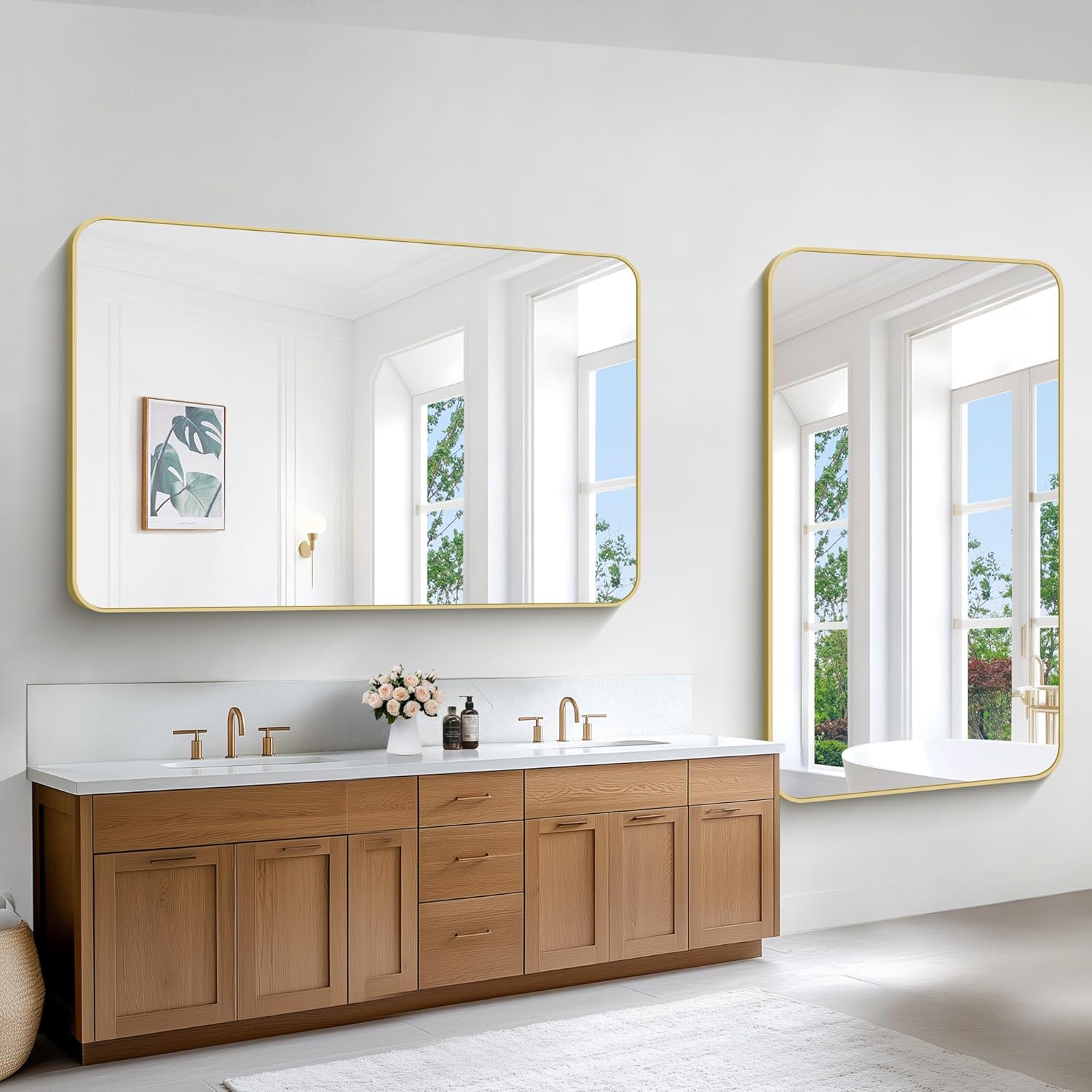 BONEWEI Gold Bathroom Mirror,60x36 inch Wall Mirror for Bathroom Wall Mounted,Round Rectangle Mirror for Bathroom Over Sink,Modern Frame for Home Decor Living Room,Bedroom Entryway,Horizontal/Vertical