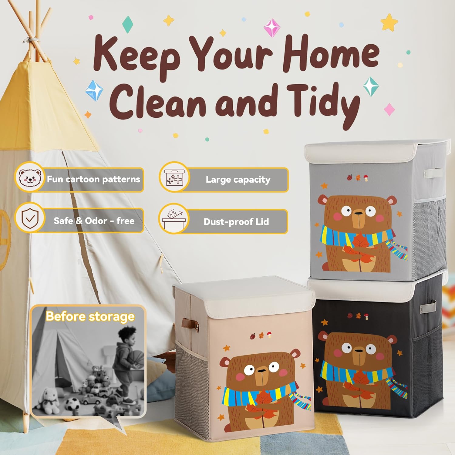 40L Large Toy Storage Box with Lid, Large Toy Box Chest for Kids, Girls and Boys, Nursery Room and Living Room, 13"x13" x16" (black-bear)
