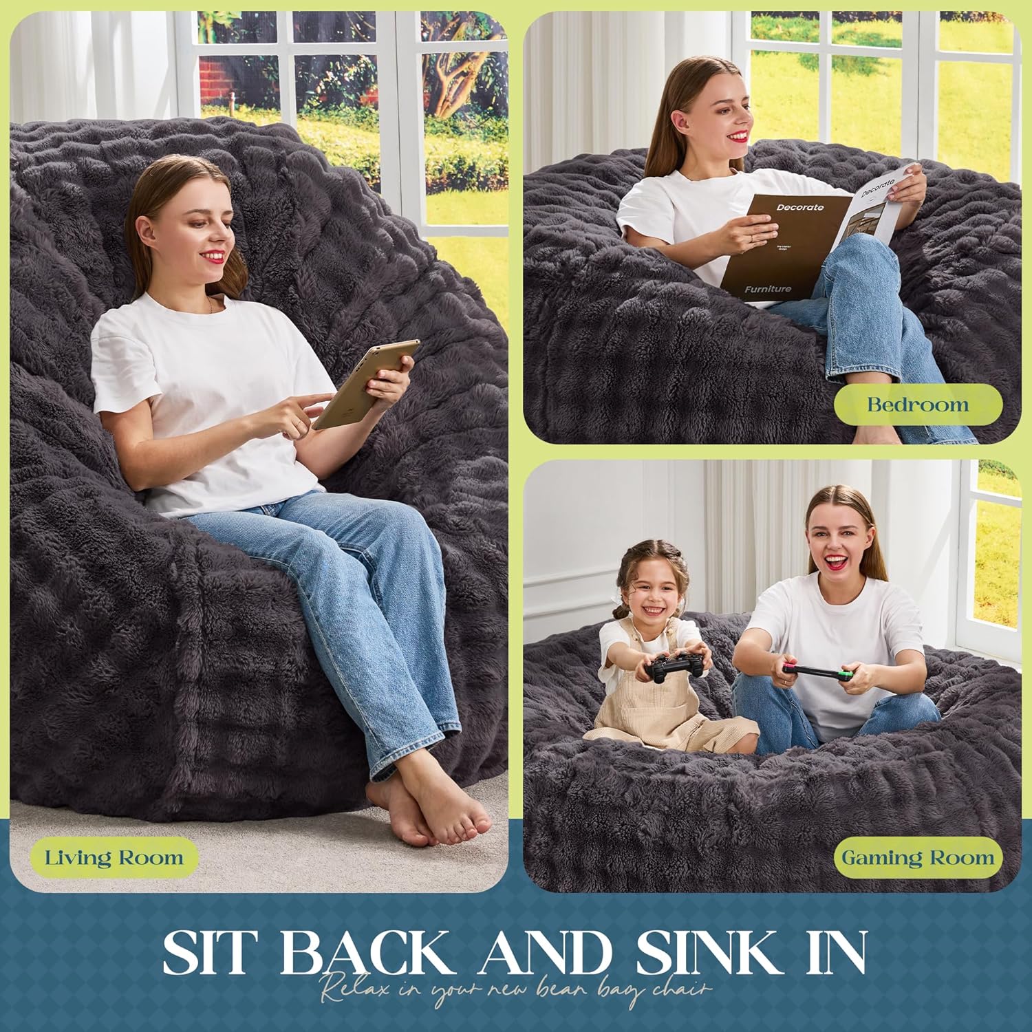 - 2-in-1 Usage: This large bean bag chairs offers two ways to use. Flip it over for added support, adapting to different scenarios for enhanced comfort and functionality.