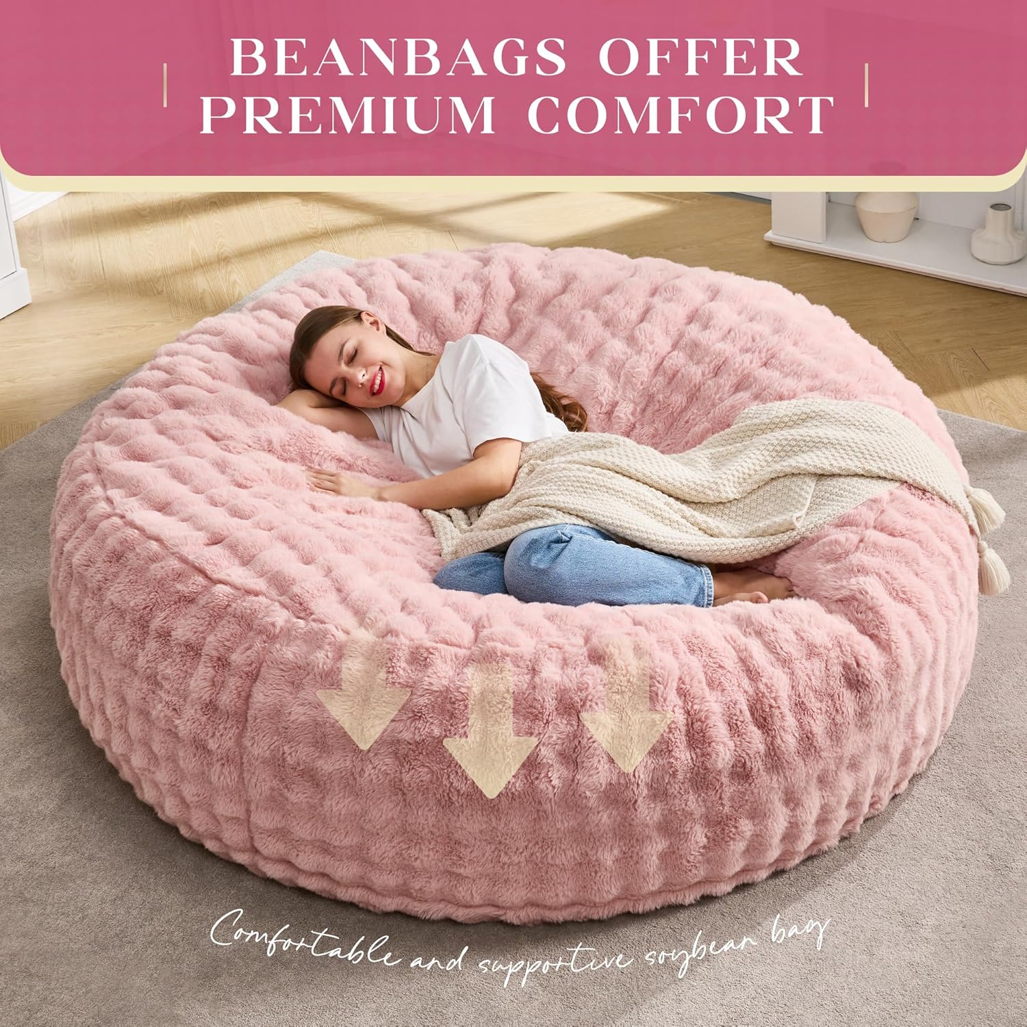 Hobestluk Bean Bag Chairs 6ft Beanbag Chair with Filler Adult Bean Bags with Fluffy & Machine Washable Cover, Giant Bean Bag Chairs for Aduts (Pink, 6FT-70" x 70" x 15")