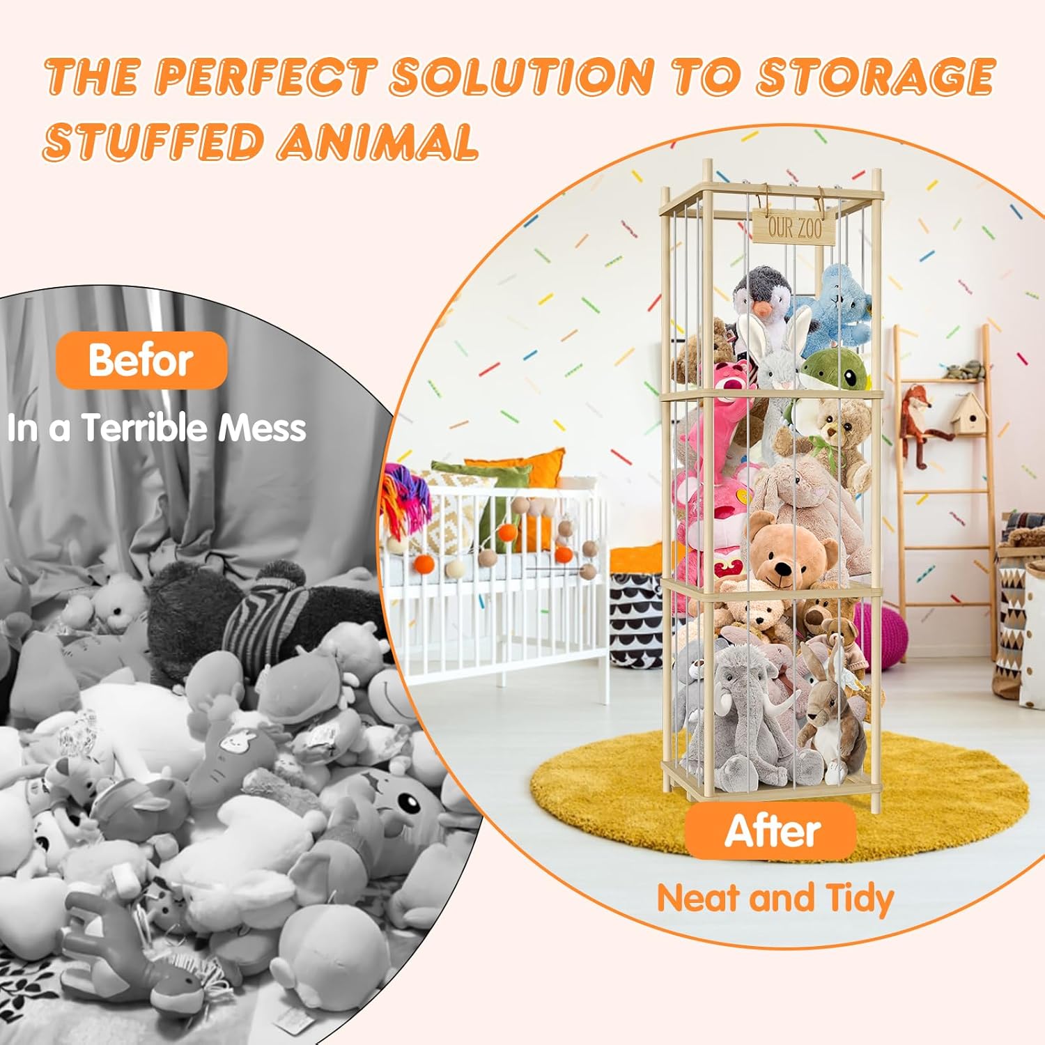 - Large Stuffed Animal Storage: 15.7 x 15.7 x 53.5 inches vertical design stuffed animal cage saves space and is large enough to hold more than 50 different sized stuffed animals. No more tripping over or stepping on stuffed animals, say goodbye to clutter and adding a decorative touch to any room