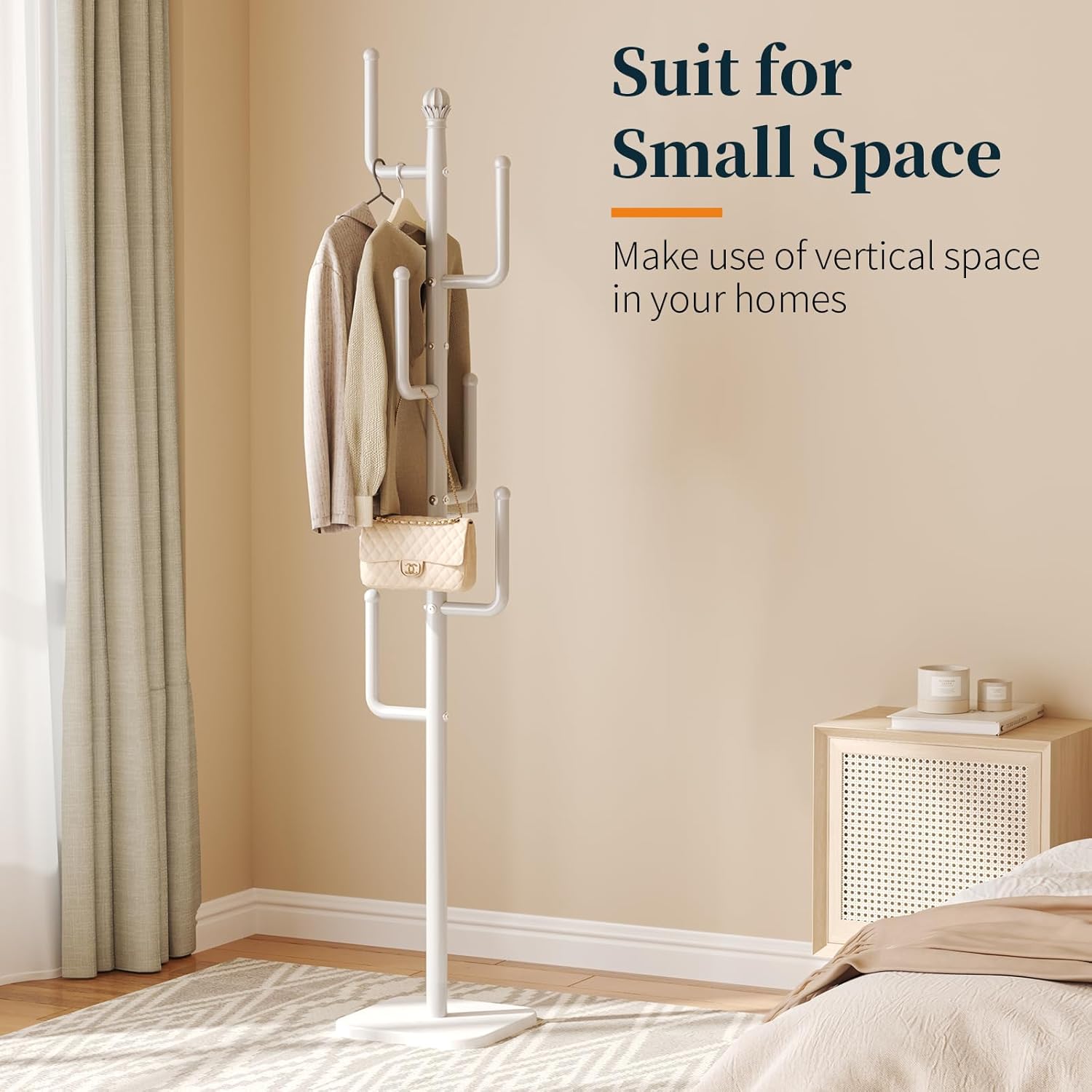 - 【Fit All Small Space】Aspire to maximize limited space? Our modern coat rack is the solution. With a small footprint, this standing coat rack tree is a helpful piece for space saving by fully utilizing vertical room. Chic and compact, the white coat rack applies to all small space in your entryways, living rooms, bedrooms, or offices.