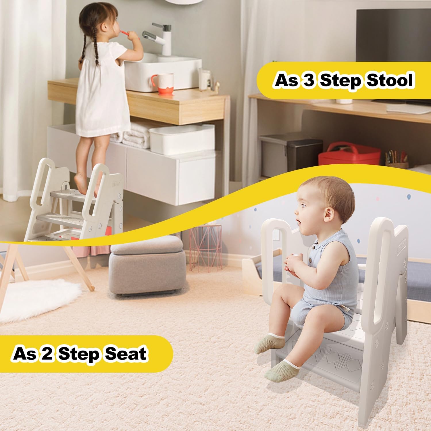 - 【2-in-1 Convertible Design】Our Kids Step Stool easily switch between 2-step stool (for sitting) and 3-step kitchen helper (for standing) , the top panel can be easily turned 270°– Meet the diverse usage needs of children in different scenarios. Perfect for bathroom sinks, kitchen counters, bathroom toilets, and bedroom closet access. Our Kitchen Helper encourages toddler independence!