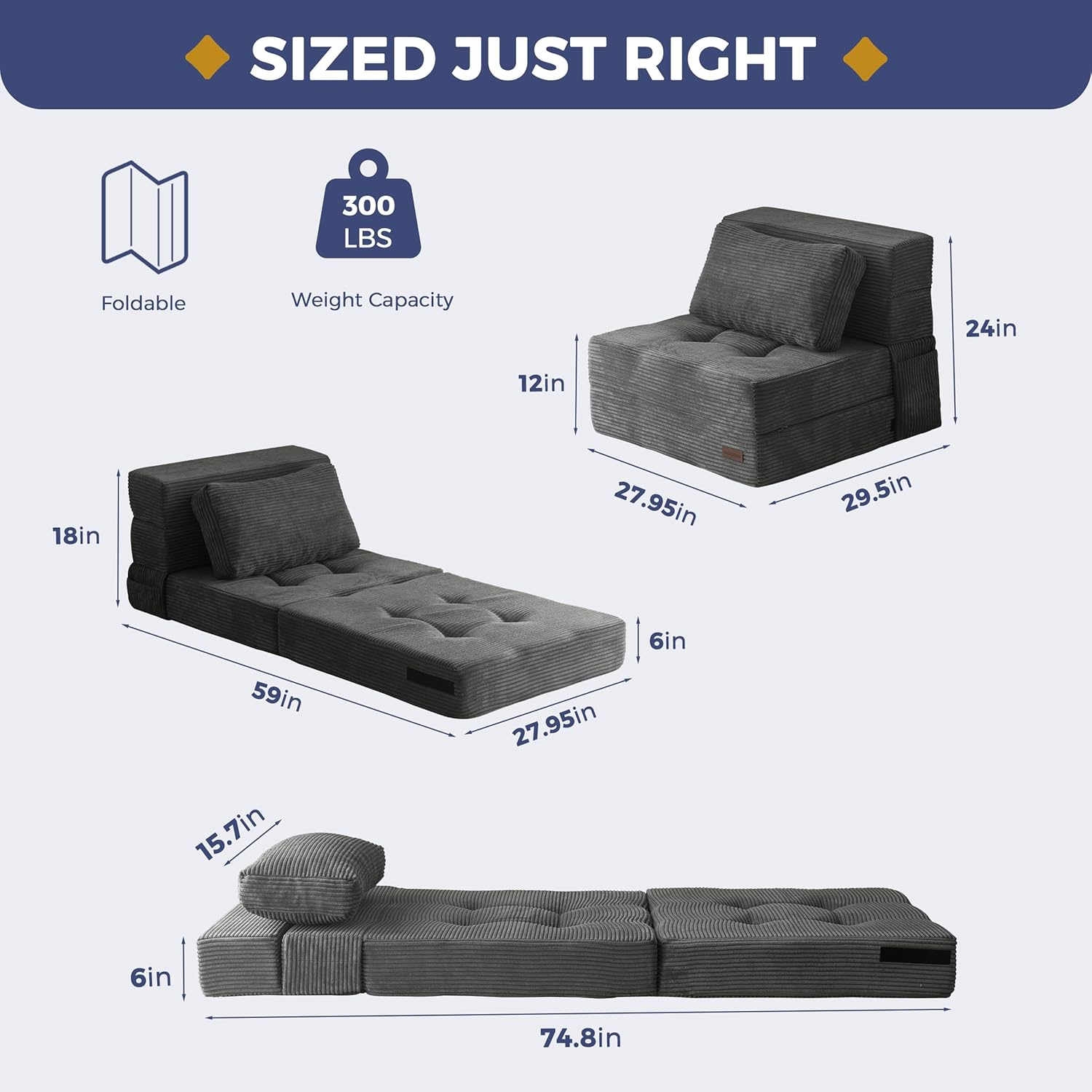 - Convertible 4 in 1 Design: The folding sofa bed easily converts into a floor sofa, chaise, recliner ottoman and bed, which can be easily and conveniently operated with a simple pull. Whether it's for personal relaxation, reading, playing, gaming, watching a film, or for guests who need to spend the night at home, it's easy to meet your needs