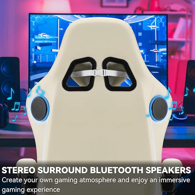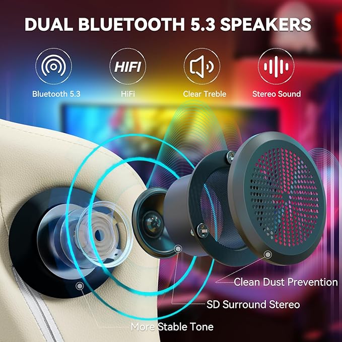 - 【5.3 Bluetooth Gaming Chair】Gaming Chair designed with dual bluetooth 5.3 speakers,the surround sound system brings you the best atmosphere in your entertainment, delivering superior and rich stereo effects with clear treble. Quickly connect to your smartphone, tablet, or other bluetooth-enabled device.