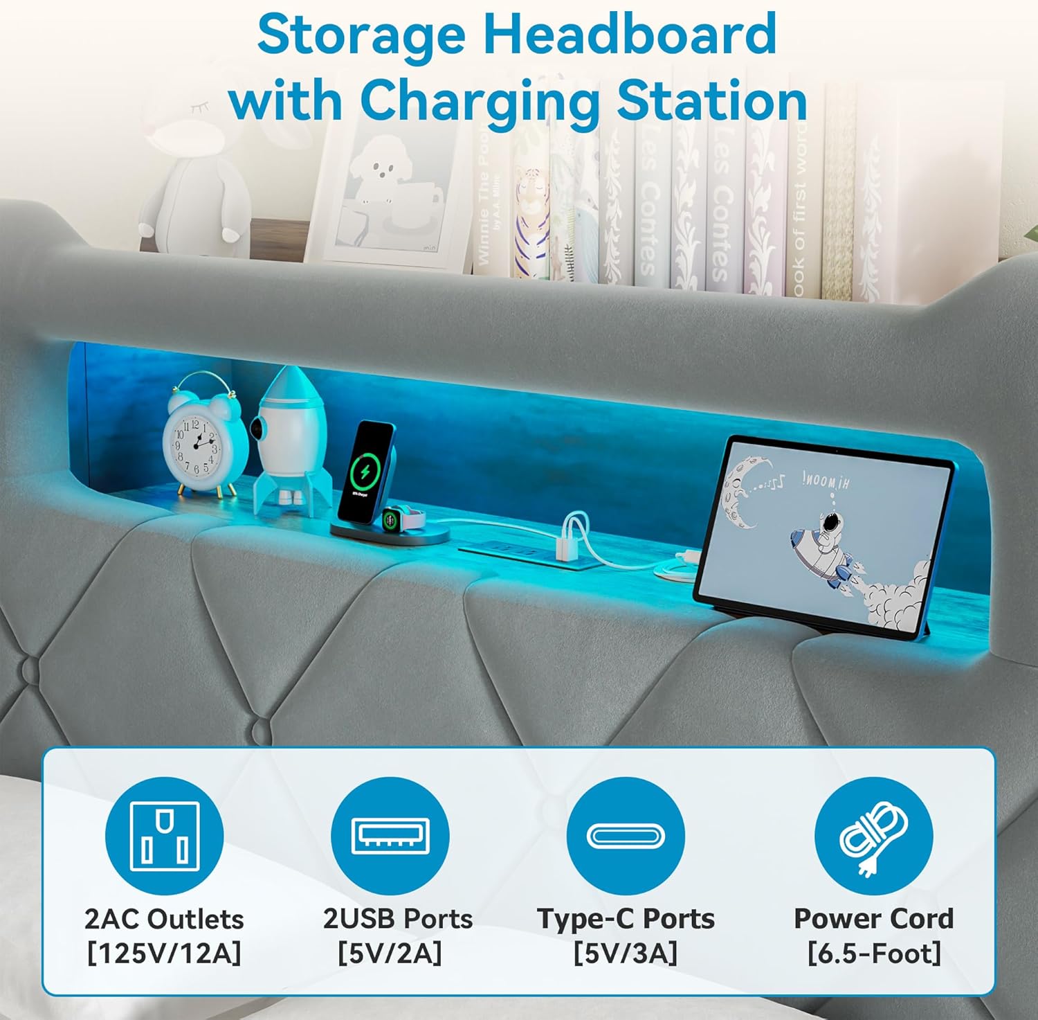 - CHARGING STATION & 2-TIER HEADBOARD STORAGE:This princess bed offers not only comfortable upholstery and an elegant look but also added more convenience. The full bed frame with charging station features two AC outlets, two USB ports, and one Type-C port right on the headboard, so your devices stay powered up without leaving bed. The 8.5" wide double-layer shelf offers ample bedside storage, like a mini bookcase, while the 11.8" deep side cubby keeps essentials within easy reach