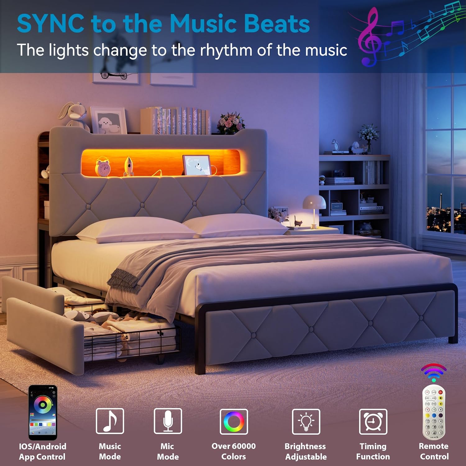 - SMART RGB LIGHTS WITH MUSIC SYNC: This full bed frame with built-in RGB LED headboard transforms your bedroom with over 16 million colors, 20+ light effects, and dynamic modes controlled by app or remote. Bold lights sync with music, setting the ideal vibe for relaxing, reading, or entertaining. From gentle nightlight for kids to vivid party colors, this velvet bed frame makes every moment magical with immersive ambiance