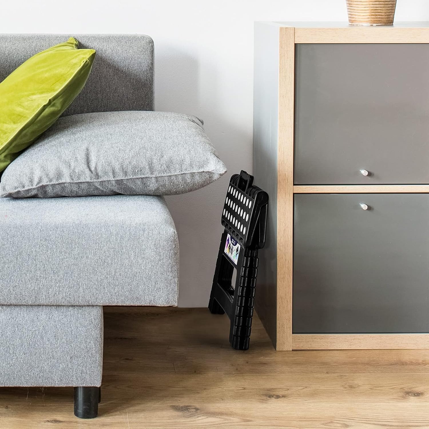 - Sturdy & Safe Black Foldable Step Stool : Our 9inch folding step stool is handy to have around for all sorts of occasions. Compact at 9"H ×12.5"L×8.5"W when opened and 13.5"H×12.5"L×1"W when folded, this durable and strong plastic step stool can support up to 300lbs. It is lightweight and versatile, and can be used both outdoors and indoors in the kitchen, bathroom or office