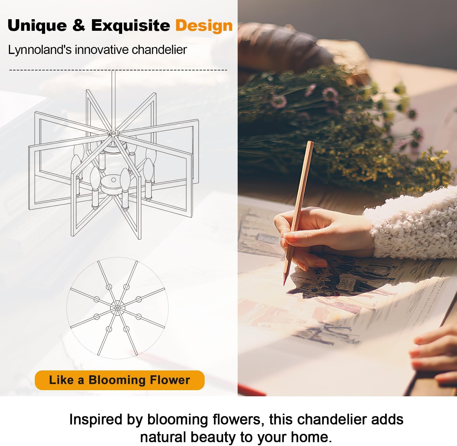 - 【Style & Design】This modern large black chandelier features 8 geometric square metal frames, each with a lamp holder. The clean, minimalist design creates a modern look, and when the frames are unfolded, it resembles a blooming flower, adding a touch of elegance to any space such as the kitchen island, living room, foyer, dining table, entryway, bedroom, farmhouse, and office.