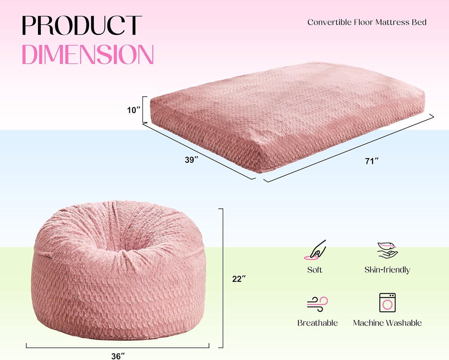 Hobestluk Bean Bag Chair Convertible Beanbag Chairs for Adults, 3 in 1 Bean Bags with Plush Chevron Cover, Adult Bean Bag Chair for Living Room, Bedroom (Pink, Twin)