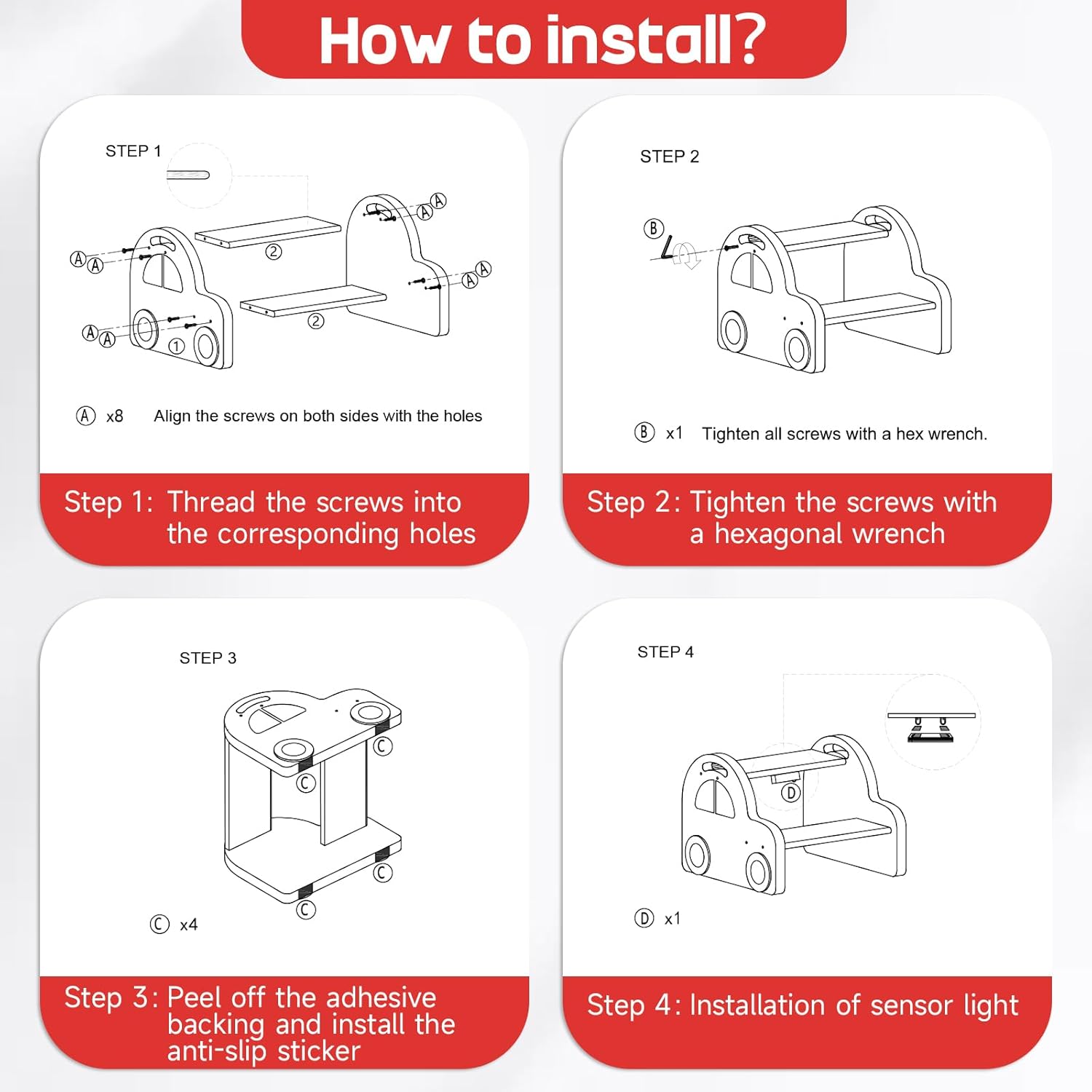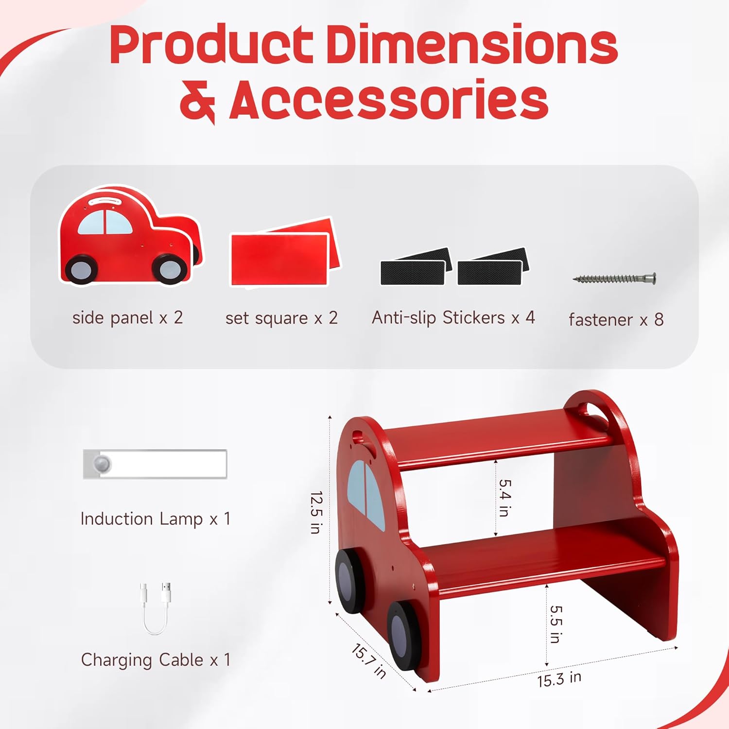 - Interesting Car-Shaped Design: This brightly colored step stool in the shape of a red car features a unique and eye-catching design that sparks children's imagination. The three-dimensional wheels add a stylish touch when viewed from the side, making it a perfect addition to bathroom sinks, kitchen countertops, toilet areas, or bedtime activities