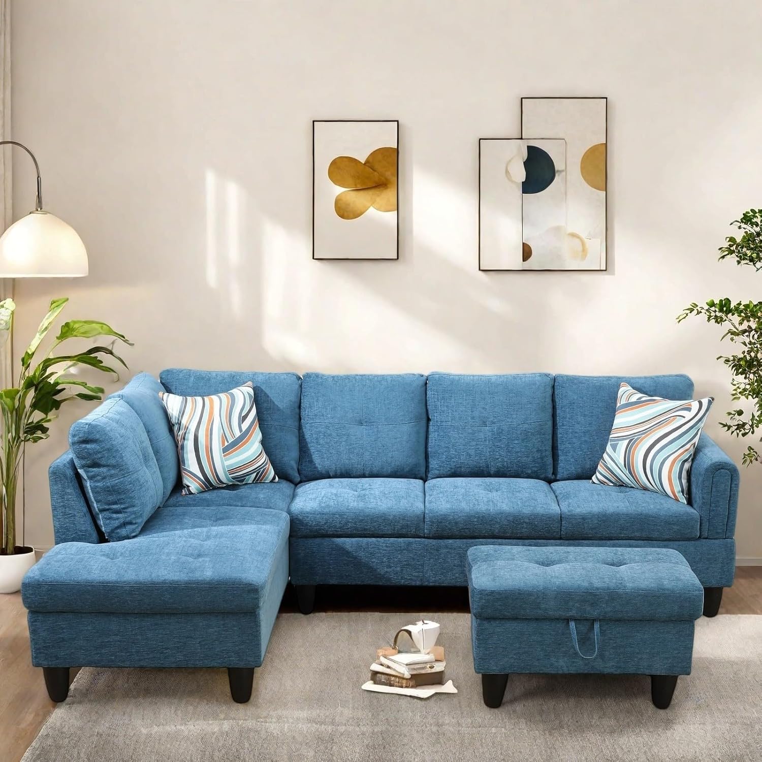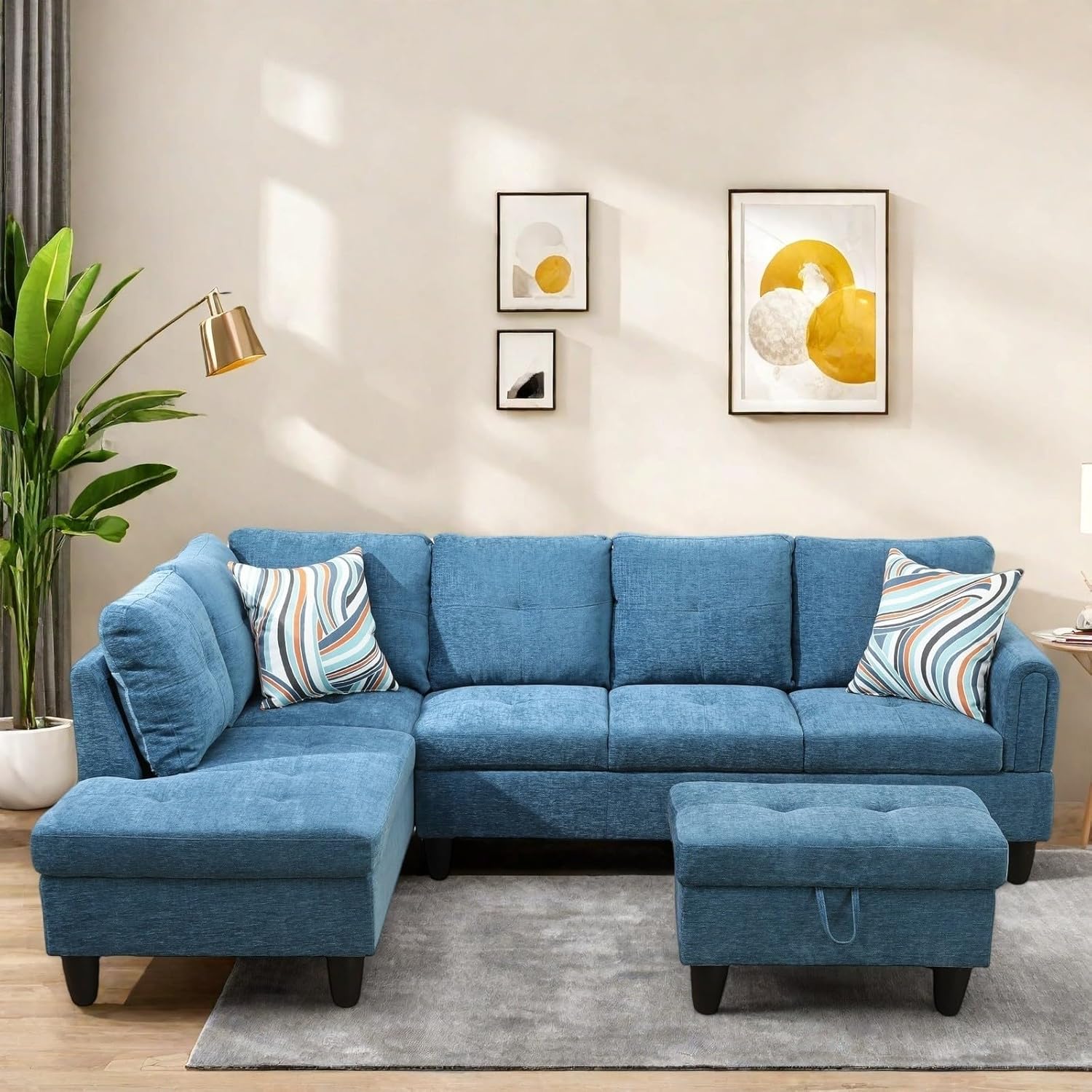 Sectional Couch with Ottoman Storage, L Shaped Couch Sofa Furniture Sets, Modern Modular Comfy Sofa for Living Room Bedroom, Blue